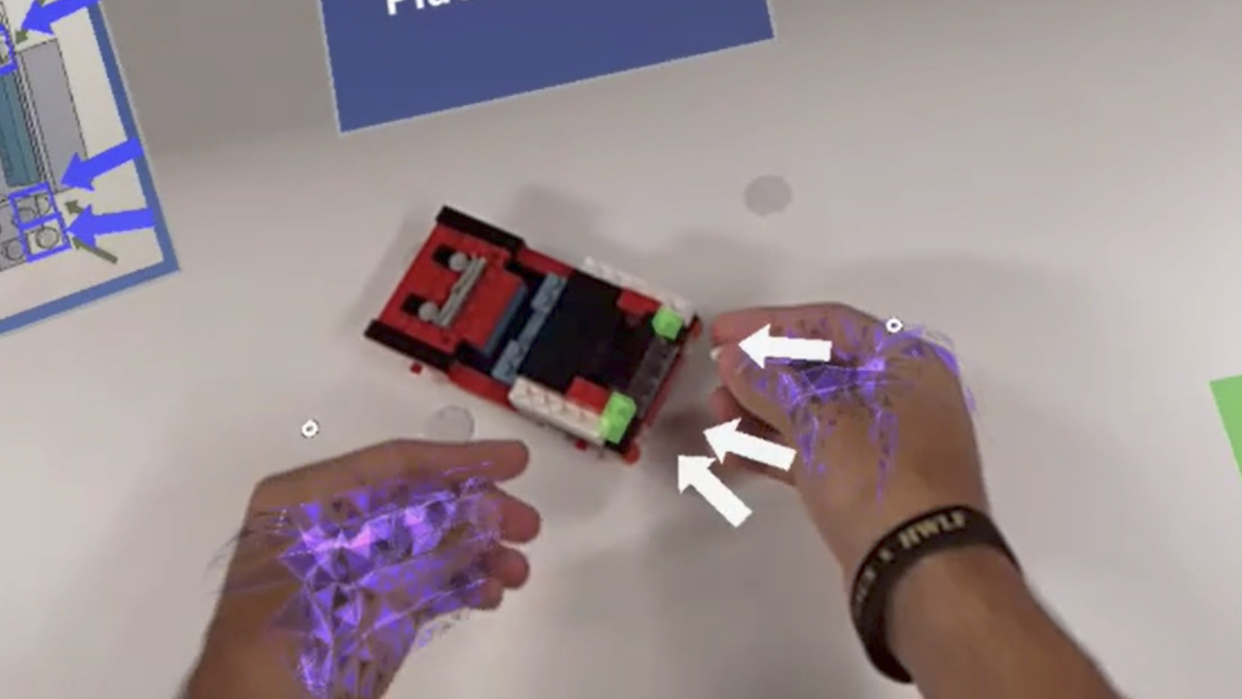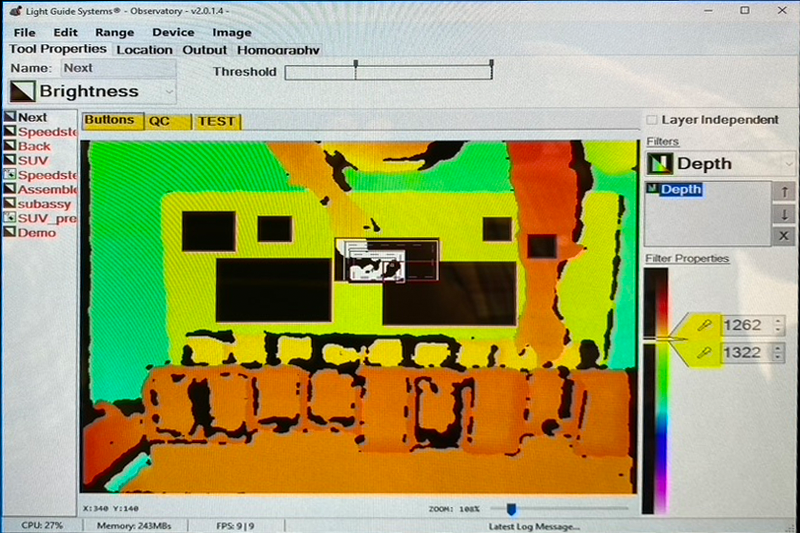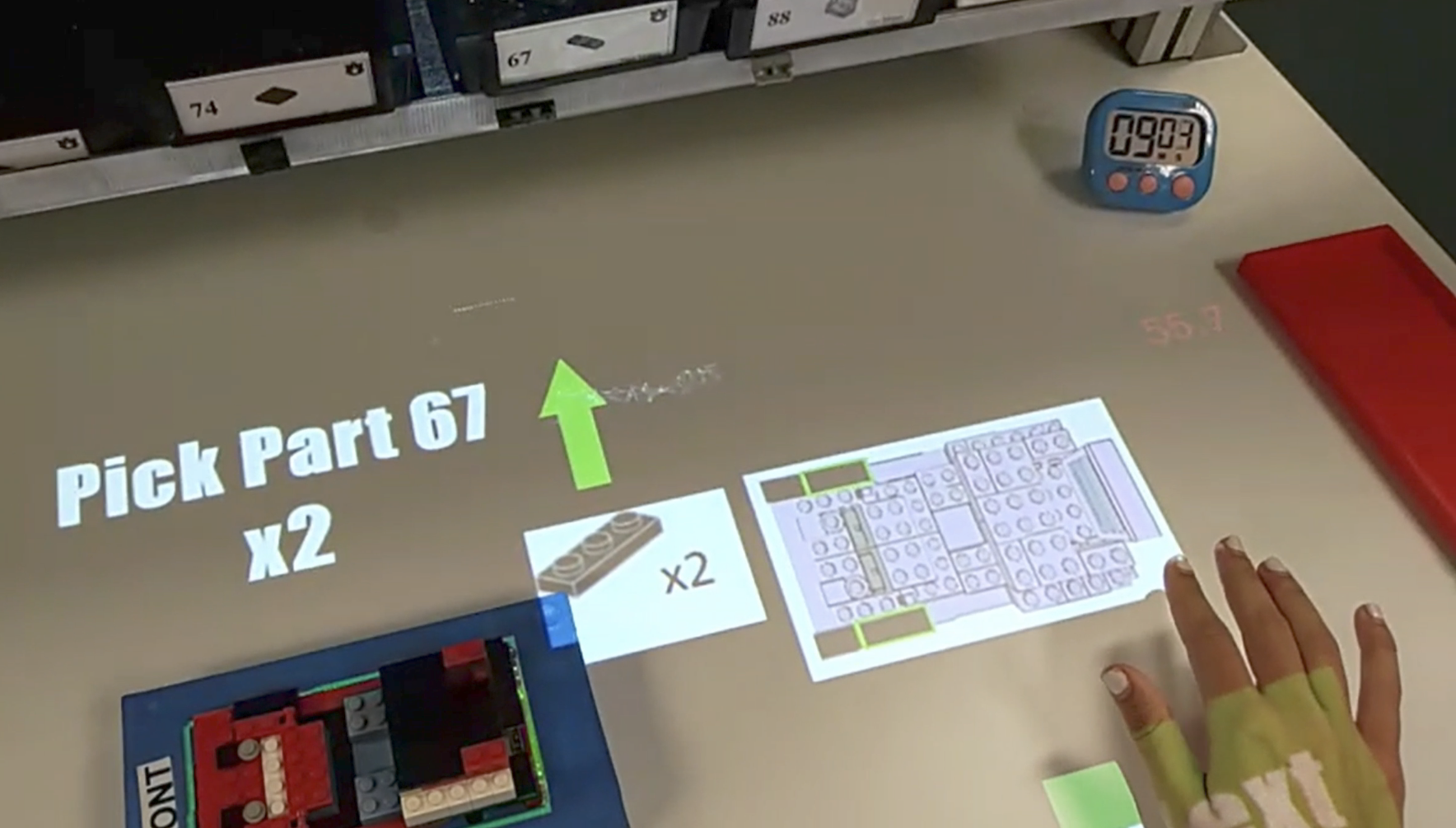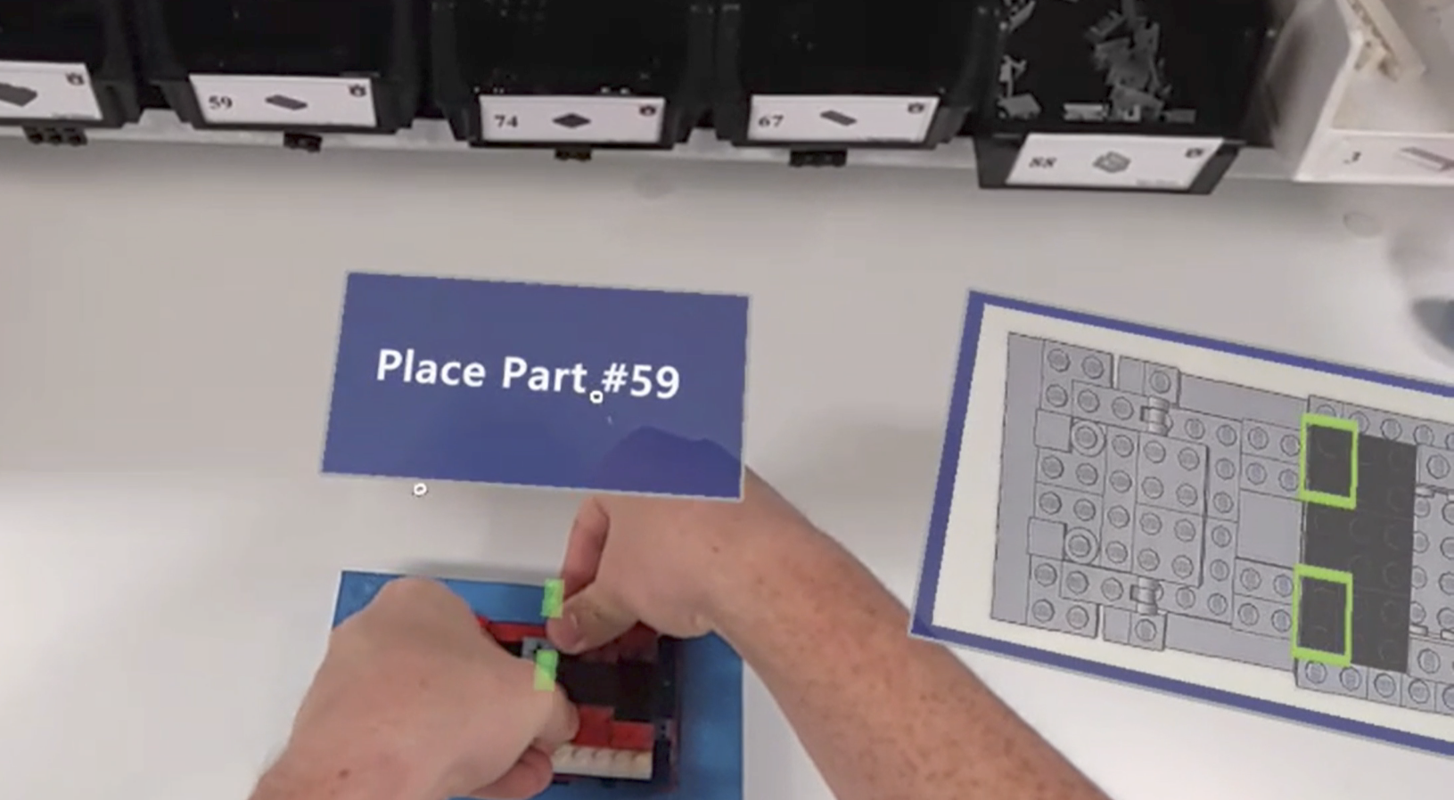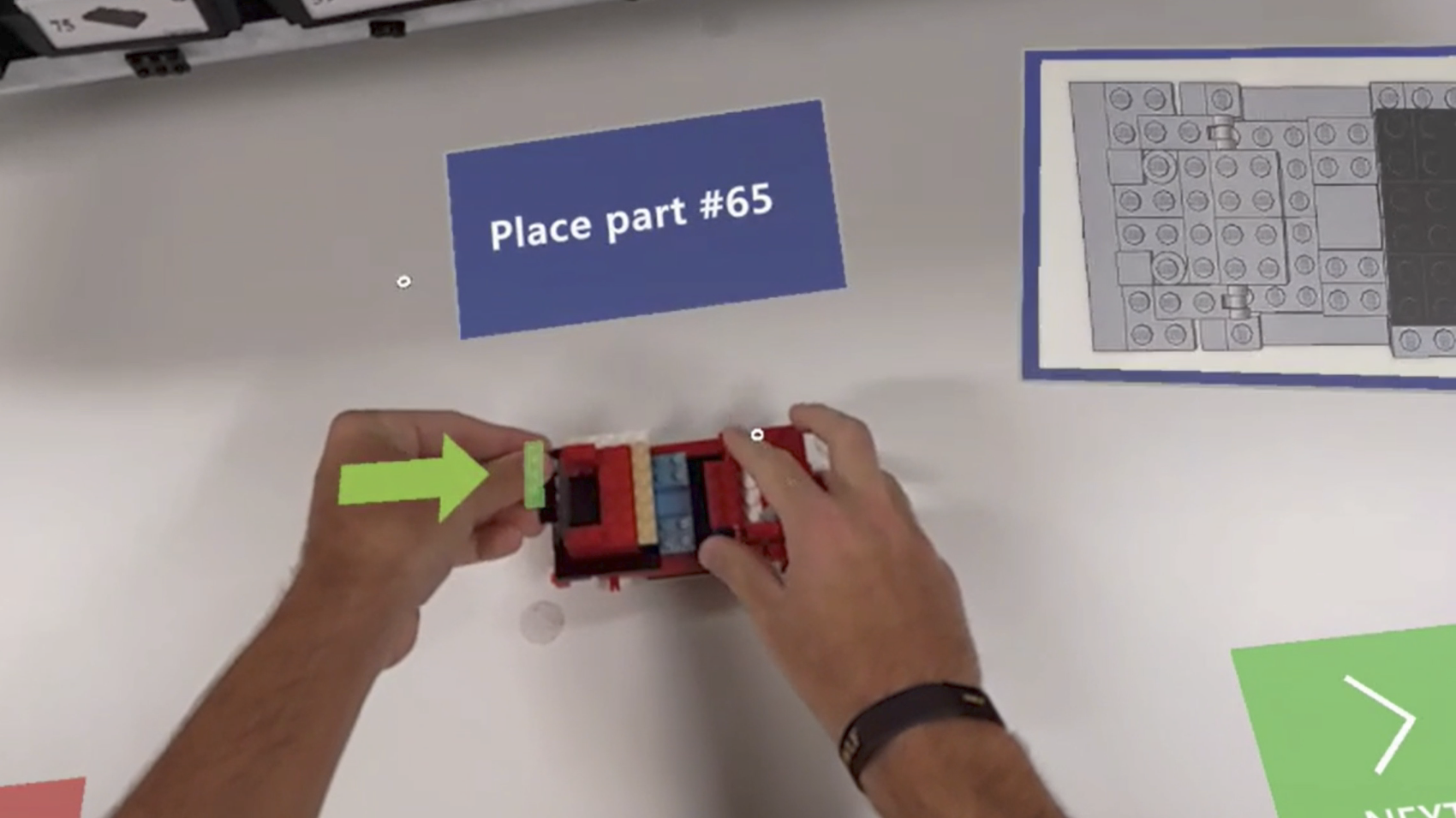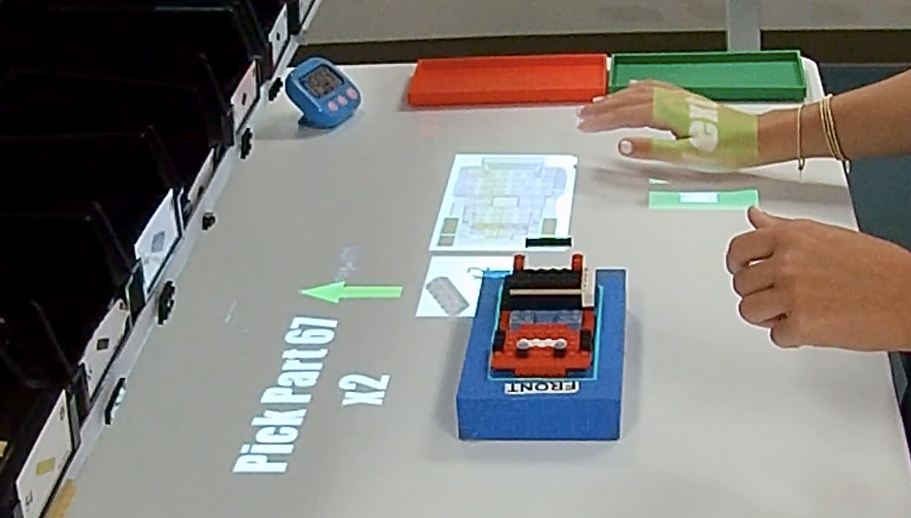 With this information the LG can, for example, recognize the operator’s hand placement and trigger system actions, warnings, or data logging events. In the ST-8 implementation, some applications of this method include triggering a green or red overlay when the operator reached into the right or wrong part bin, advancing to the next assembly step when the operator swipes over the virtual NEXT button, and automatically advancing when it appeared that the operator had installed a piece.
