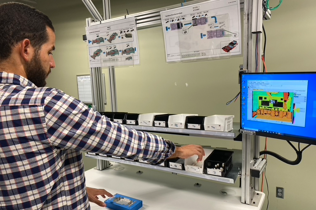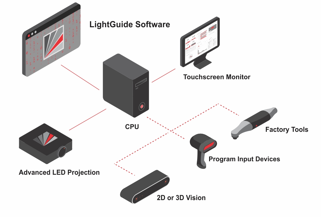 ST-8 is equipped with a PAR system by LightGuide3 (LG), a Michigan-based company focused on innovative, AR-based manufacturing solutions. As shown in Figure 4.5, Their system uses a Windows PC, industrial-grade projector, and 2D or 3D vision system, along with other optional input devices and tools. All components are commercially available and integrated by the LG software, where digital work instructions are both authored and played back.