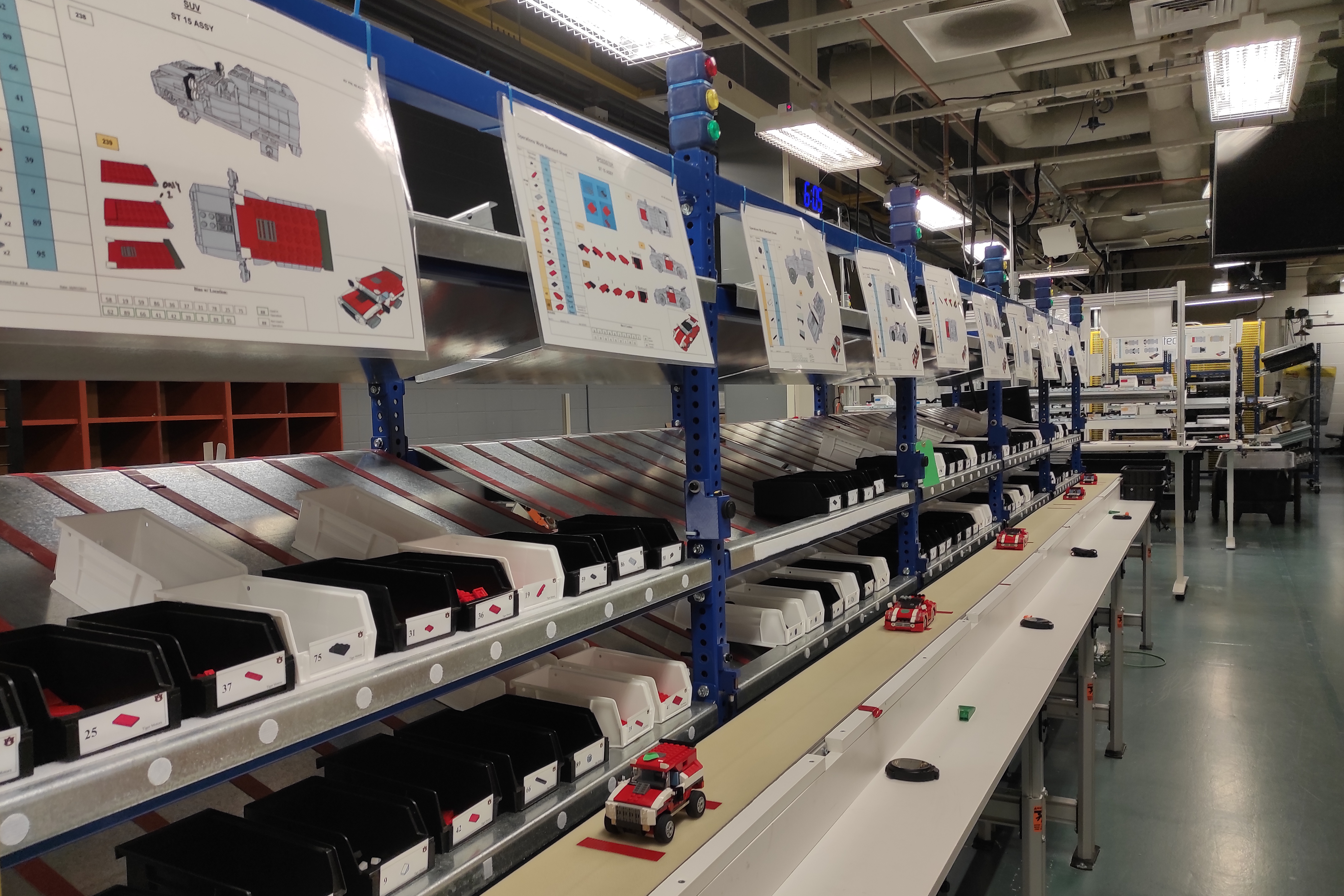 The Lean Lab assembly line consists of two manufacturing cells followed by a conveyor with five additional stations. Each manufacturing cell consists of five workstations arranged in a U-shape. Each participant is tasked with the operation of one of 15 workstations involved in the SUV assembly.