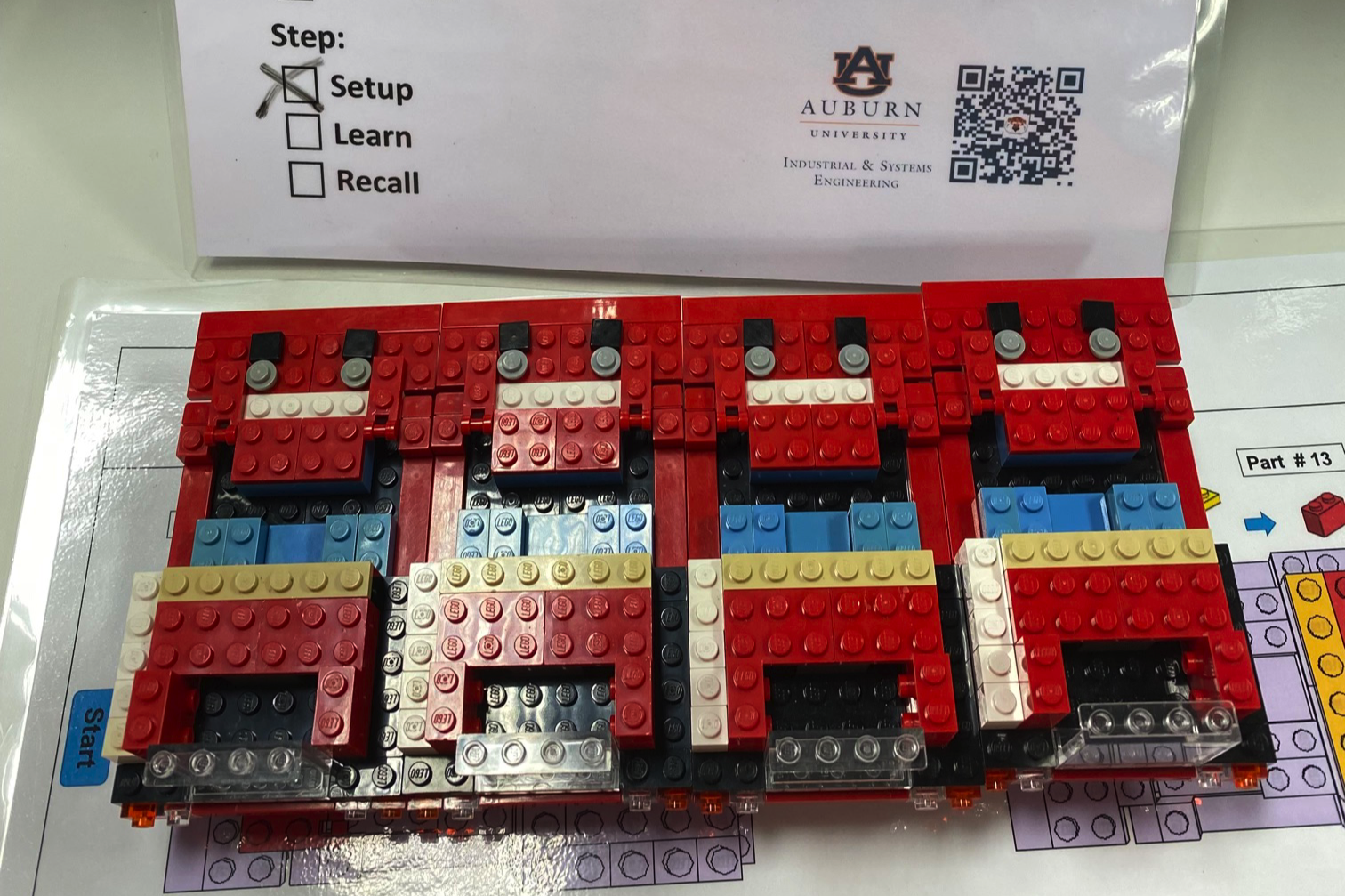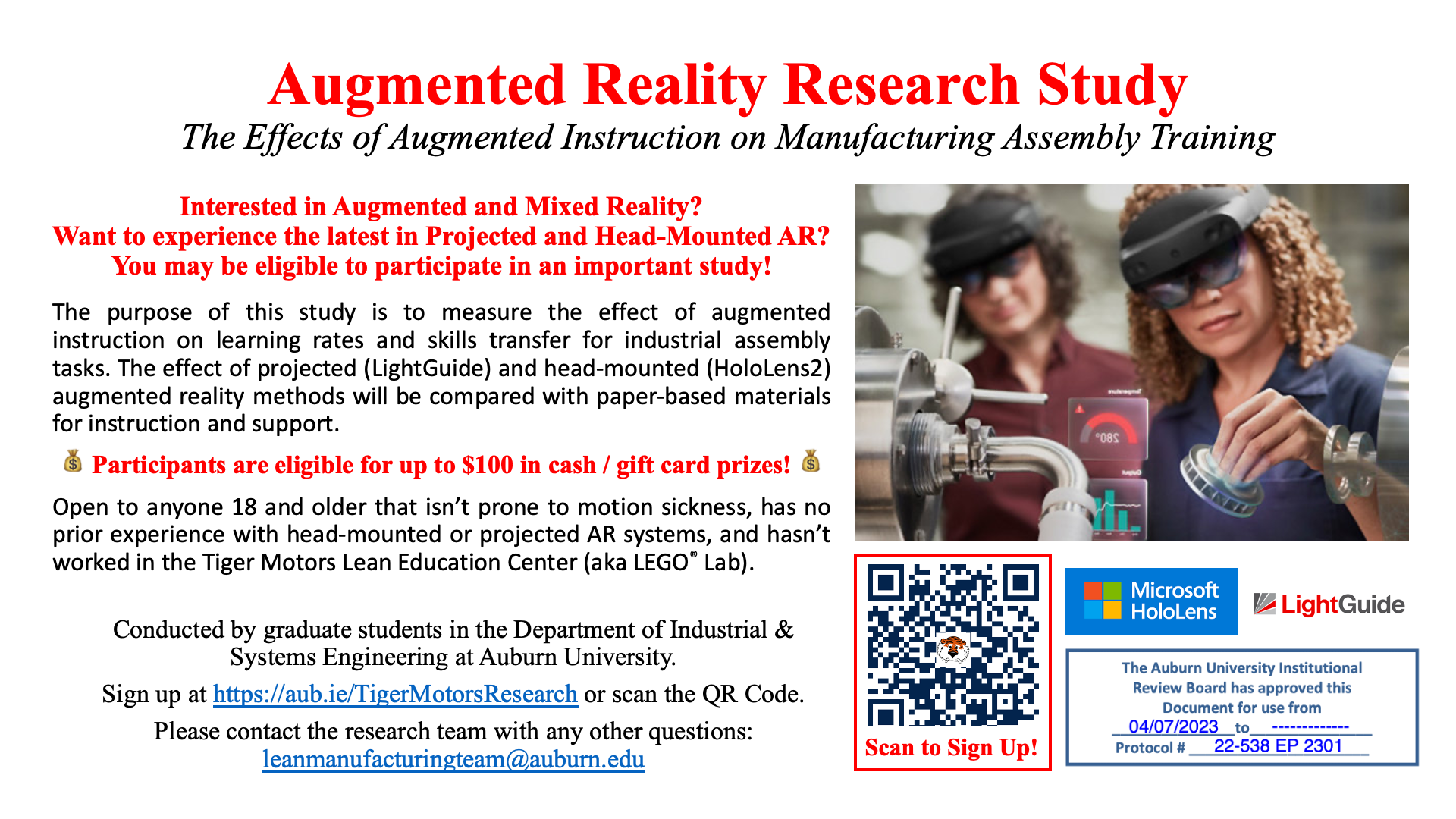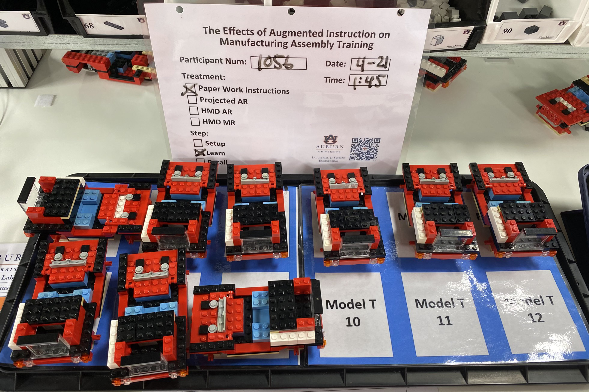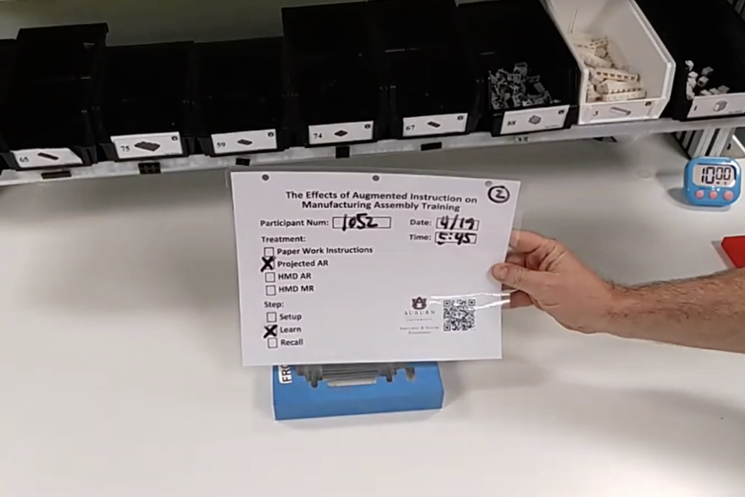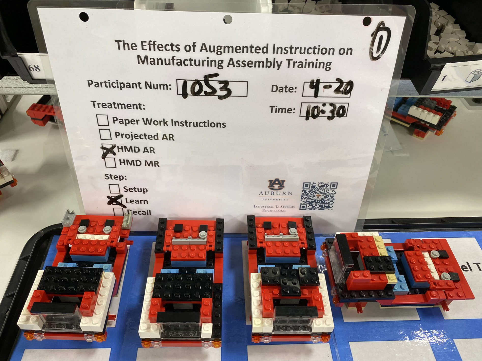 To assess the effect of augmented instruction on operator performance, human subjects were asked to learn and repeat a simulated manufacturing assembly task. A convenience sample of adult participants without relevant experience were recruited from the Auburn University community and randomly assigned to one of four instructional treatments, each with a different level of augmentation. This between-groups approach was adopted to allow for direct comparison between different levels of the treatment and to minimize the learning effect that would otherwise occur over repeated trainings.