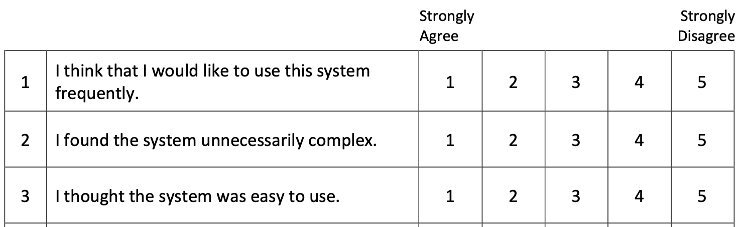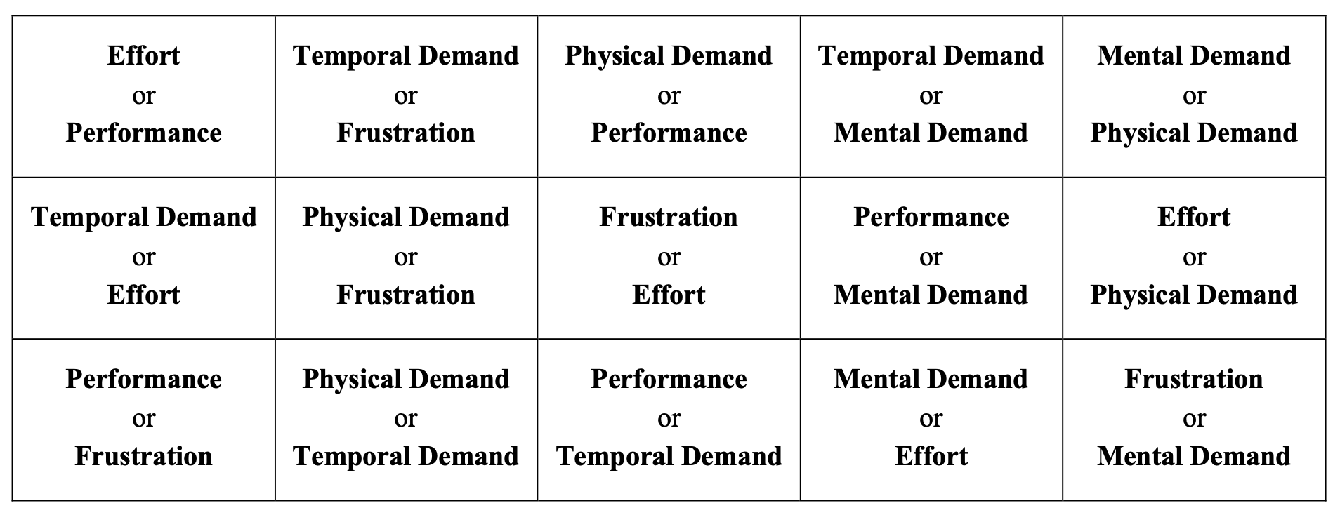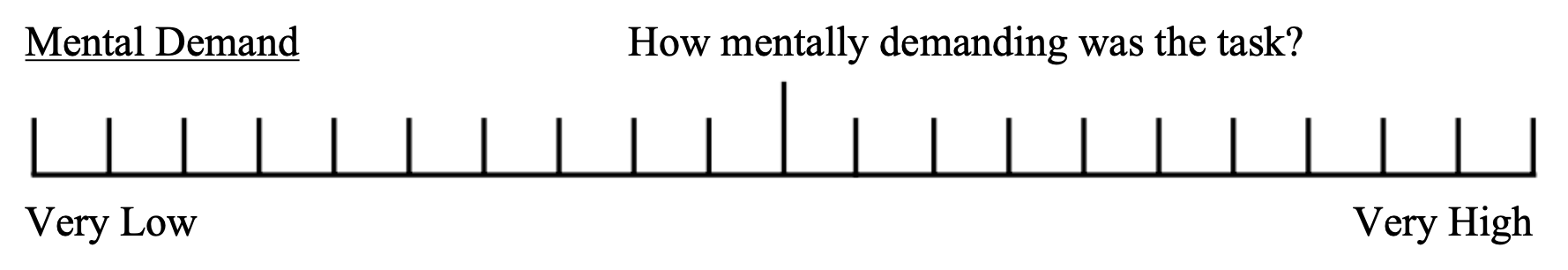 These instruments were scored as described by their providers. As noted in Section 4.11.1.2, TLX responses for the first five participants were corrected by rescaling to the standard 100-point system, rounding up. TLX and SUS results were written to separate CSV files and reviewed for correctness.