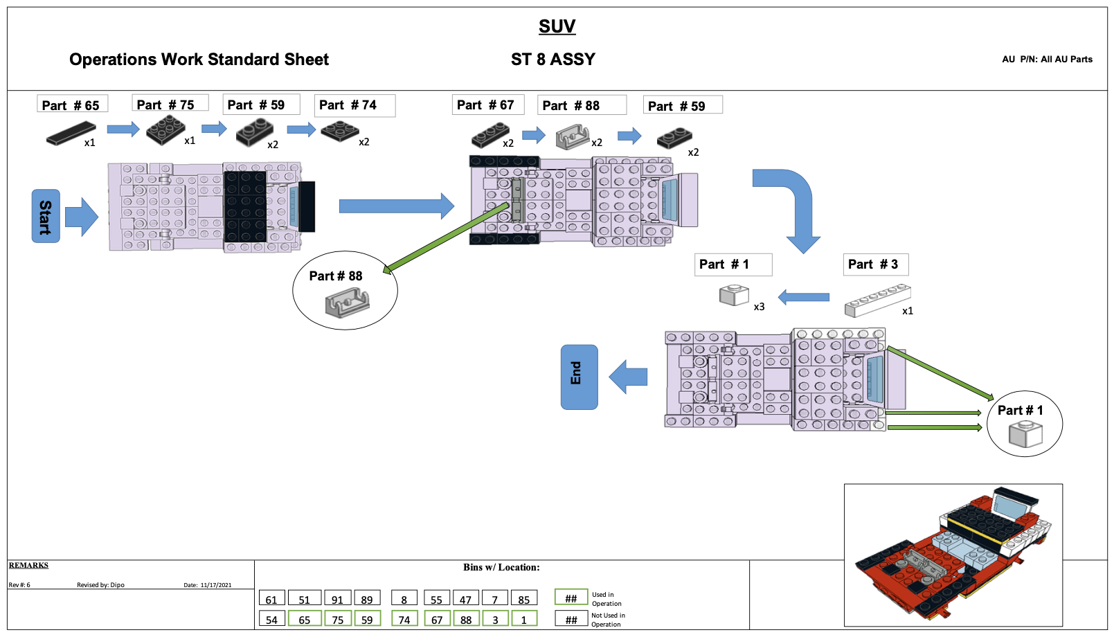 Participants acted as operators learning part of the Model T (SUV) assembly process. A completed SUV model is pictured in Figure 4.1 (b). This process has been repeated thousands of times in lean education courses without significant incident.