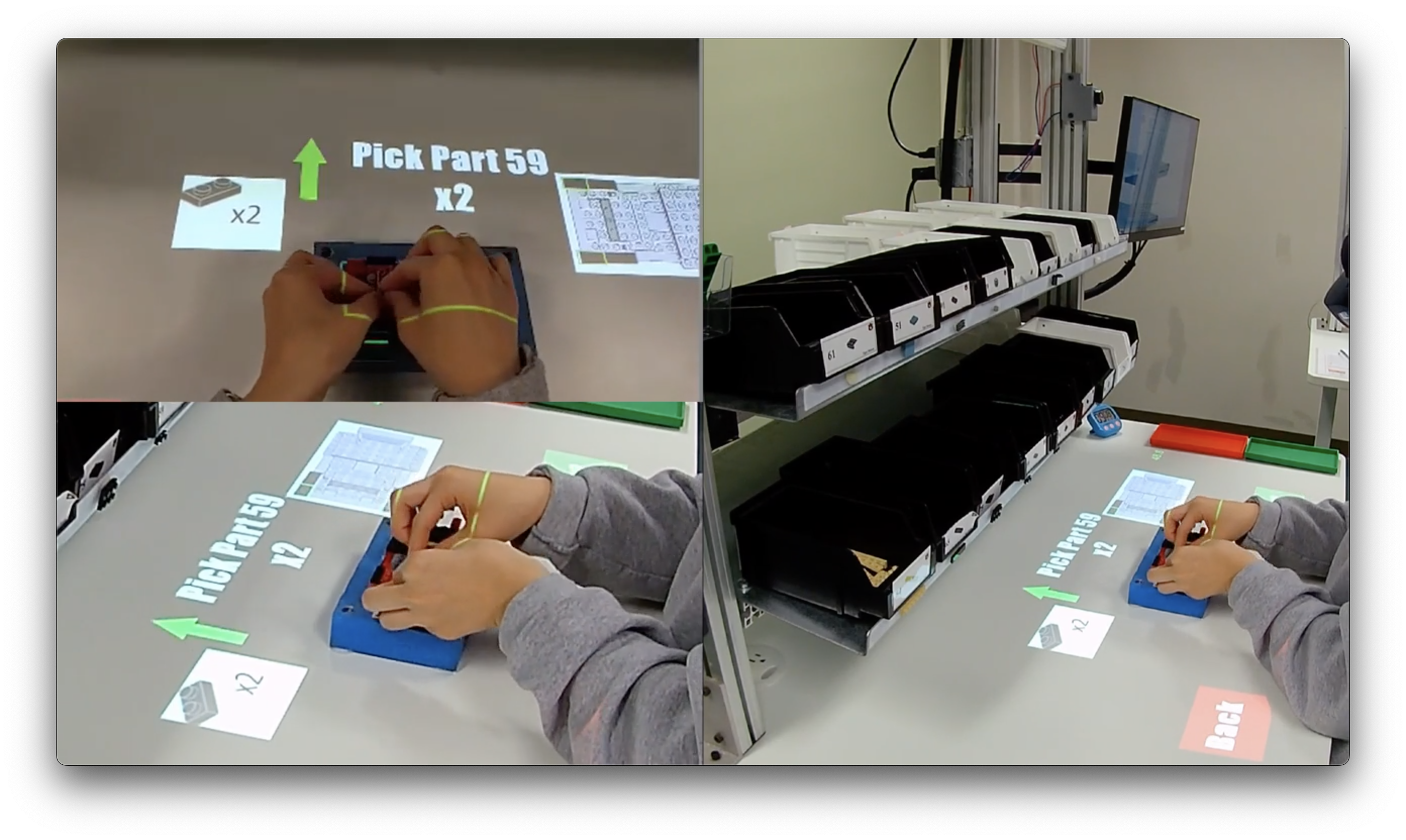 Projected AR (PAR) systems integrate work and instruction by projecting the latter onto the work surface. Work steps are displayed sequentially, either under operator control or automatically triggered.
