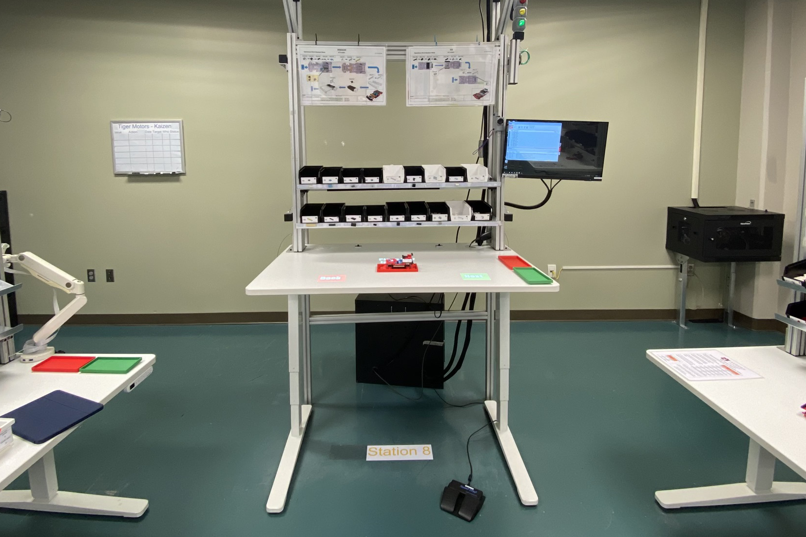 The green and red trays pictured on the right of the work surface are for finished goods and rework, respectively. The central fixture provides for standard placement and secure retention of the workpiece. All of these are removable to allow the lab to operate with varying levels of Lean practice in effect.