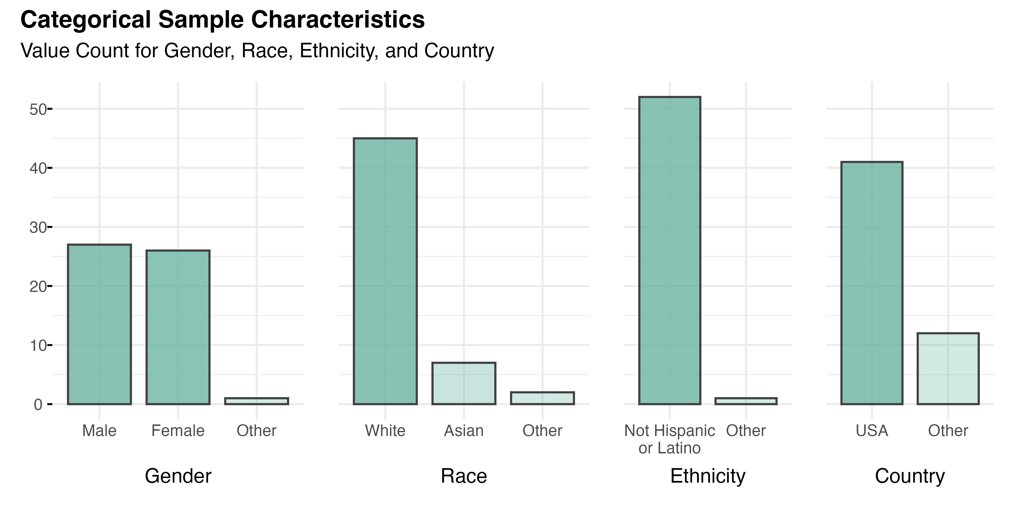 Of the sample’s 54 participants, 89% (n=48) reported that they mainly speak English at home. As shown in Figure 5.3, the gender composition was relatively balanced, with slightly more males (n=27, 50%) than females (n=26, 48%). The racial makeup of the sample was predominantly White (n=45, 83%) and Asian (n=7, 13%), with smaller representations from two other groups. Fully 98% of participants (n=52) reported a non-Hispanic or Latino ethnicity. The majority of participants (n=41, 77%) were from the United States, though nine other countries were represented, including S Korea (n=3) and Poland (n=2). Saudi Arabia, Germany, UK, Indonesia, Australia, India, and China were also listed as countries of origin by one participant each (n=1). All of this aligns with the study’s recruitment focus.