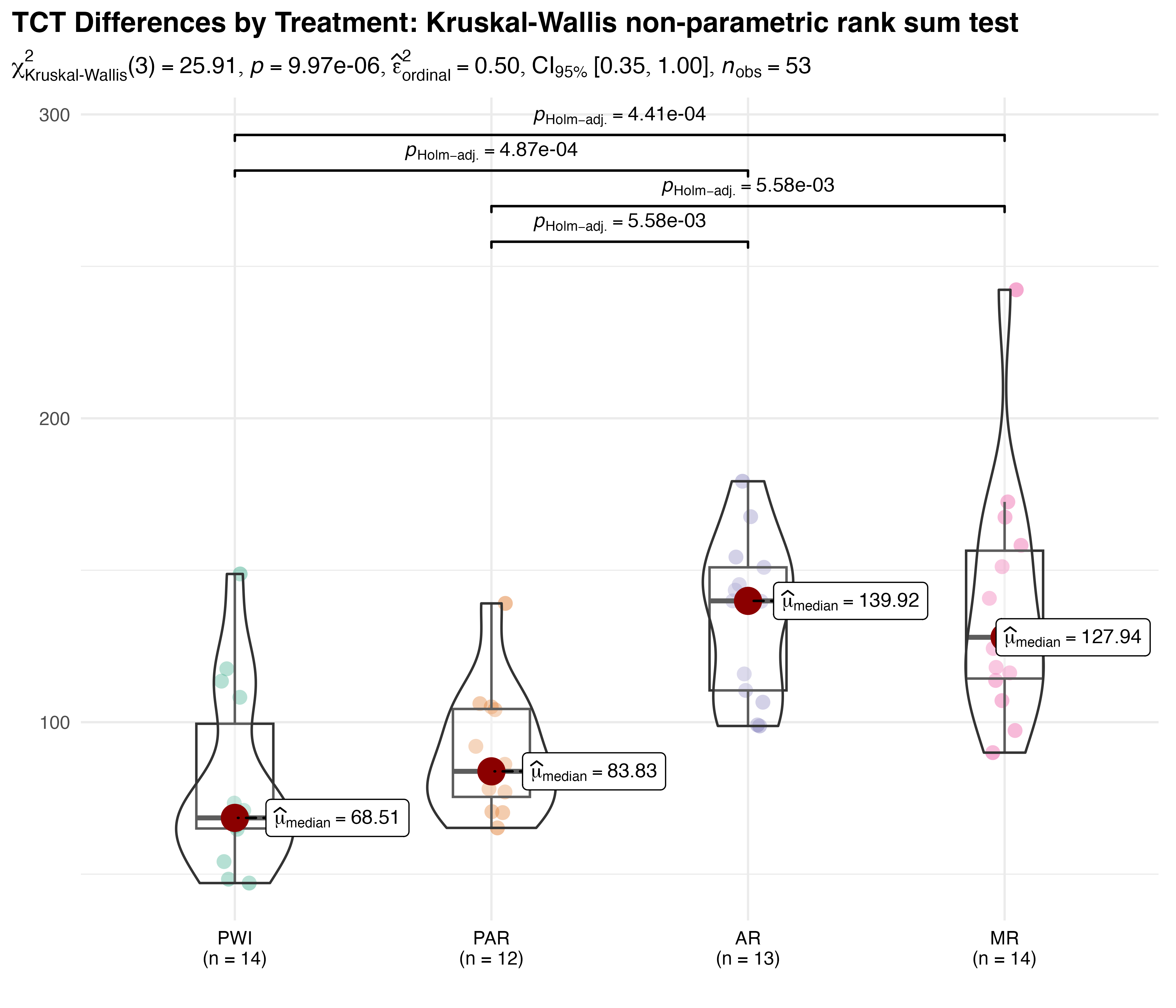 was tested by comparing the average TCT of each treatment group to understand the magnitude, direction, and significance of differences.