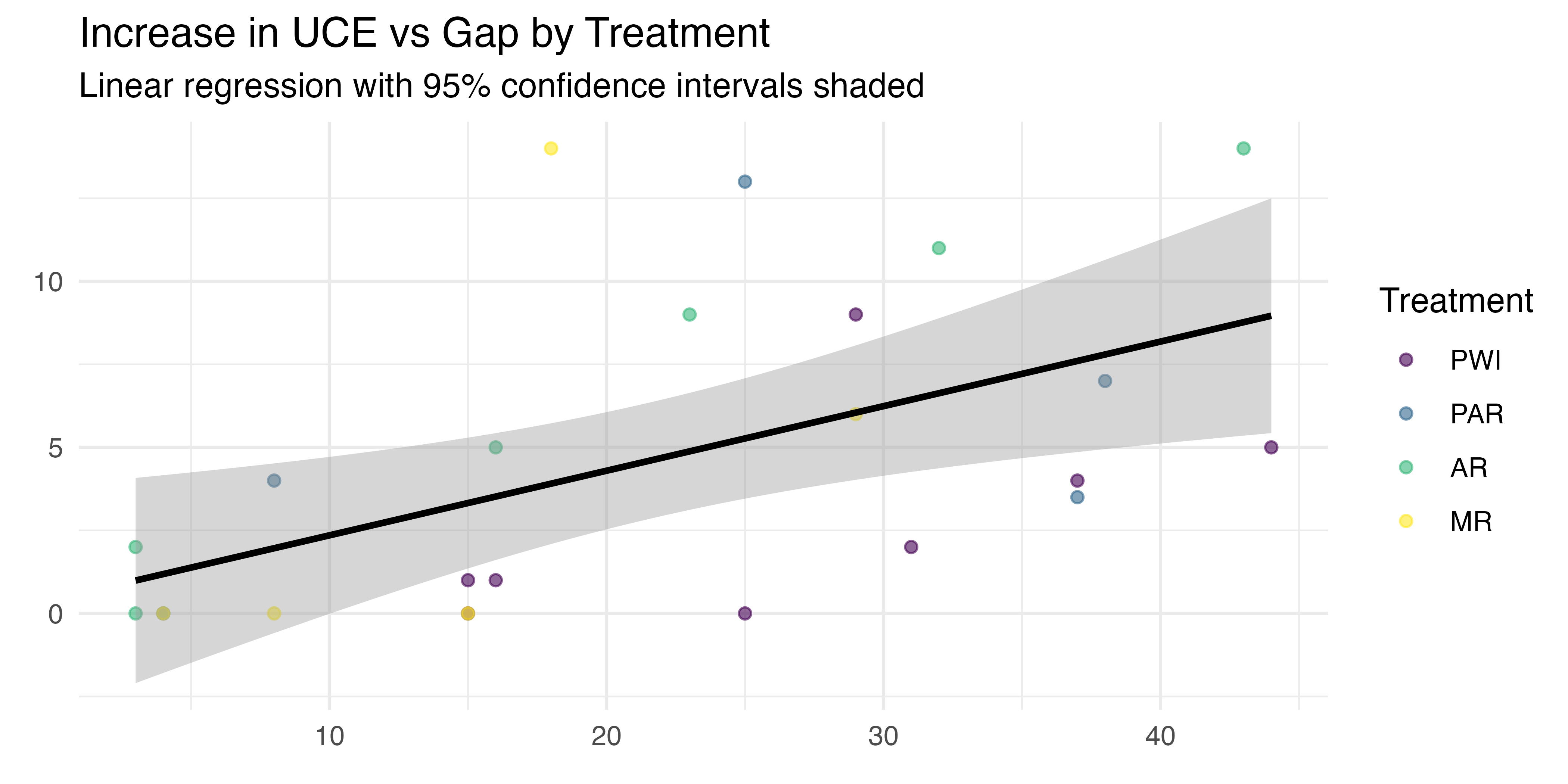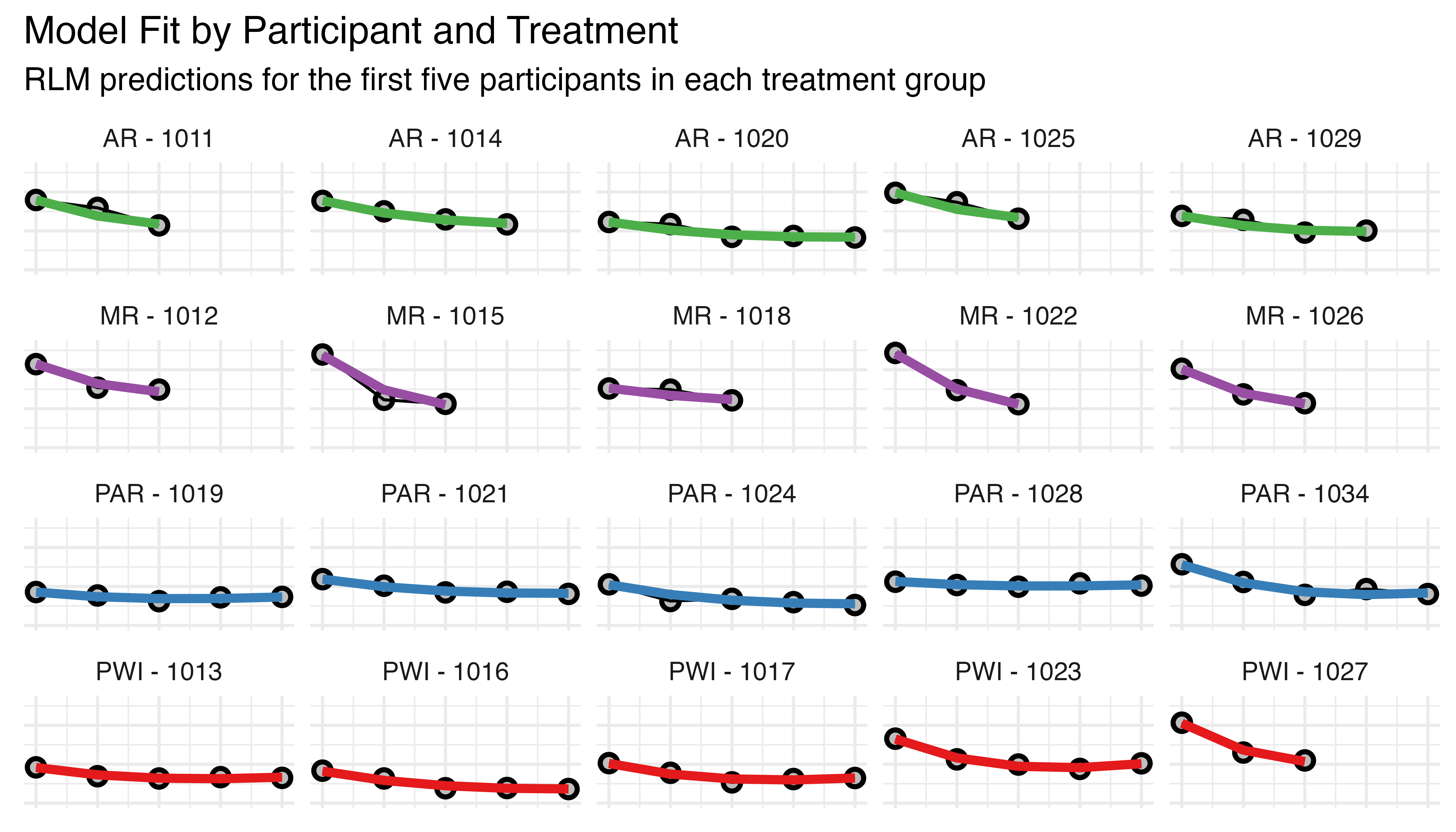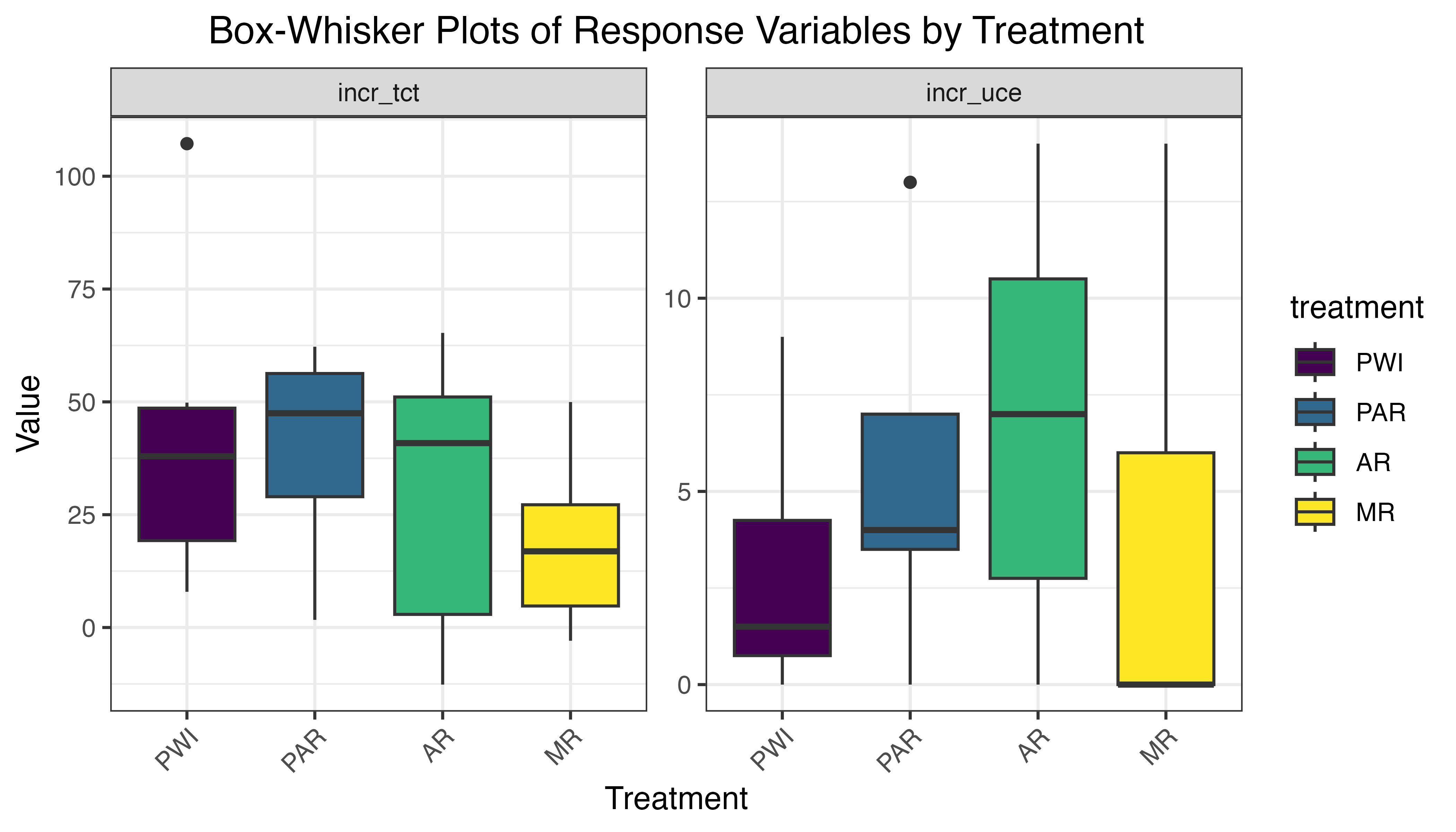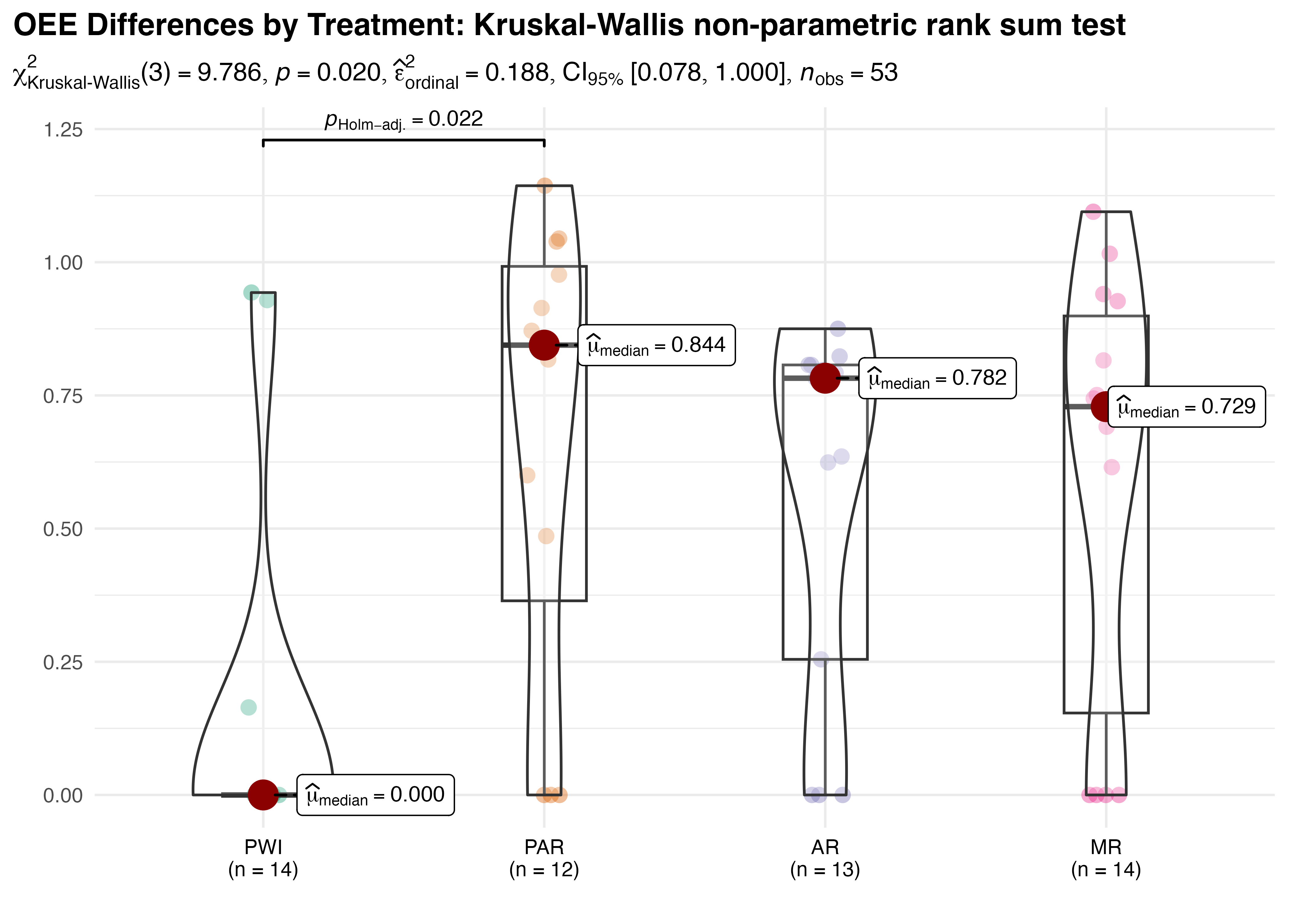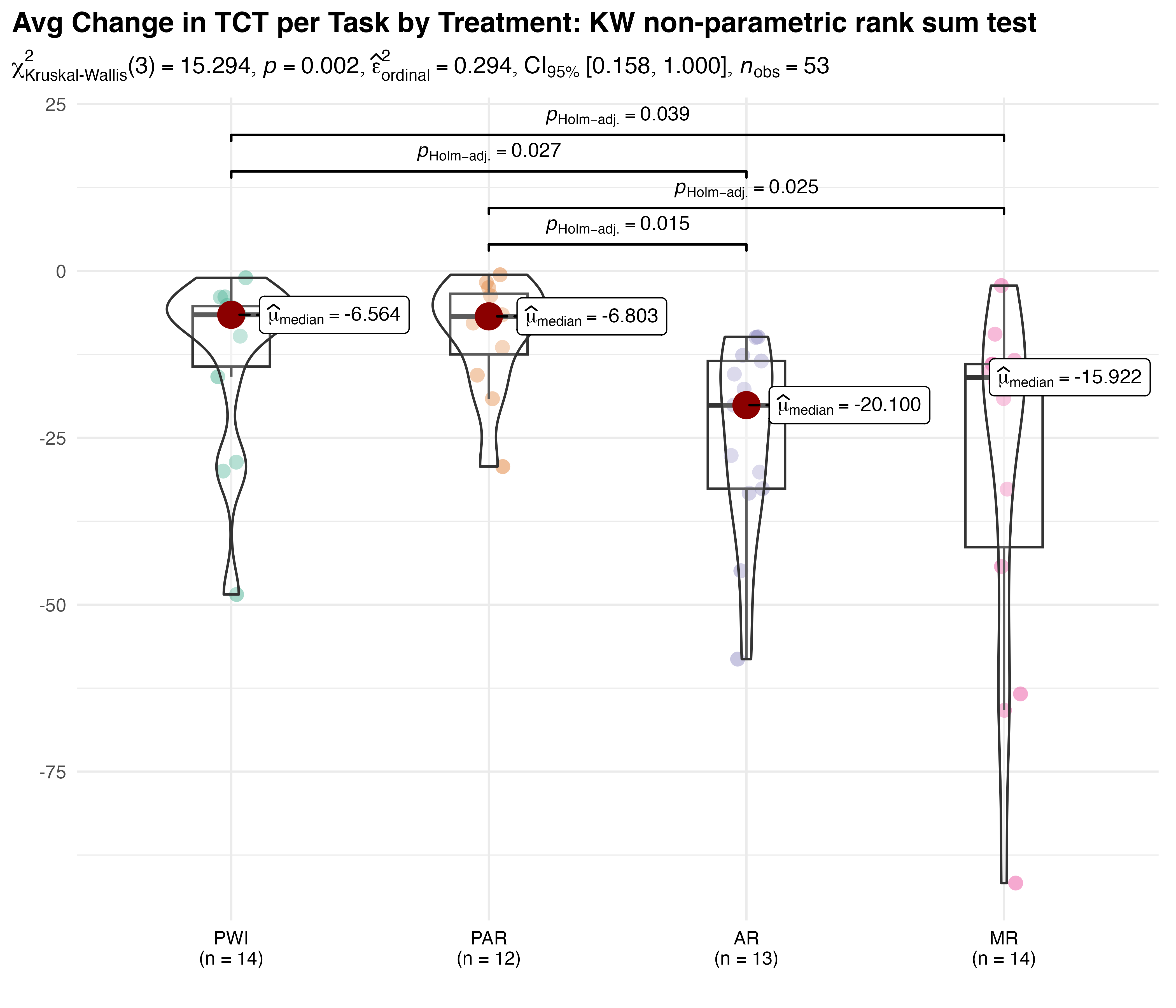 These calculations utilize a normal approximation to address ties (AR) and zero values (PWI and MR), and p-values are adjusted for multiple comparisons using the Holm method. The results indicate that, despite large effect sizes (\(r\) > 0.50 for all treatments), none of the observed differences can be conclusively attributed to the treatments (adjusted p-values > 0.08 in all cases) given the sample size and variability. A final test was conducted to determine if the changes differ by treatment, as shown in Figure 5.41. Once again, no significant differences were identified (p = 0.479).