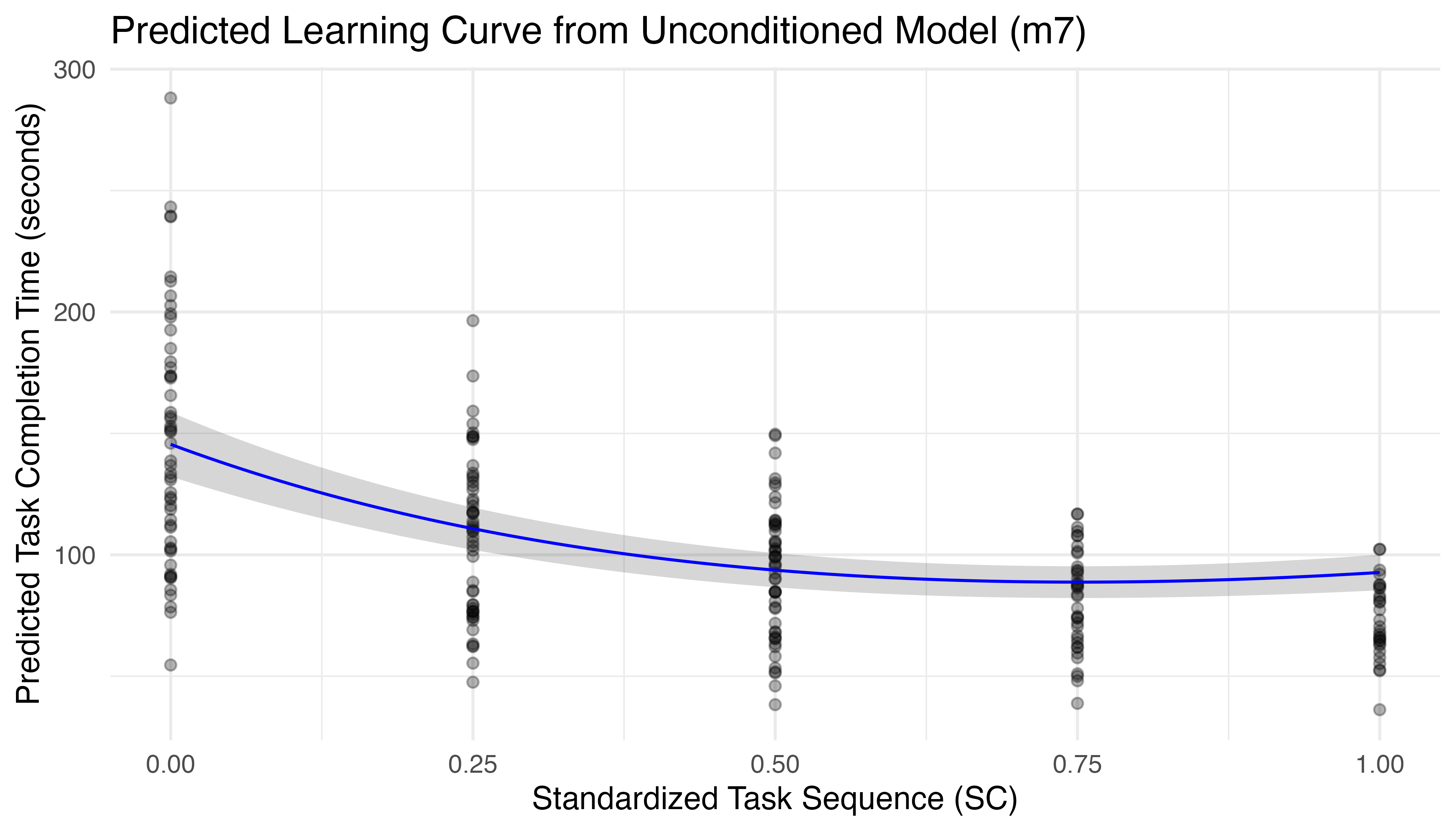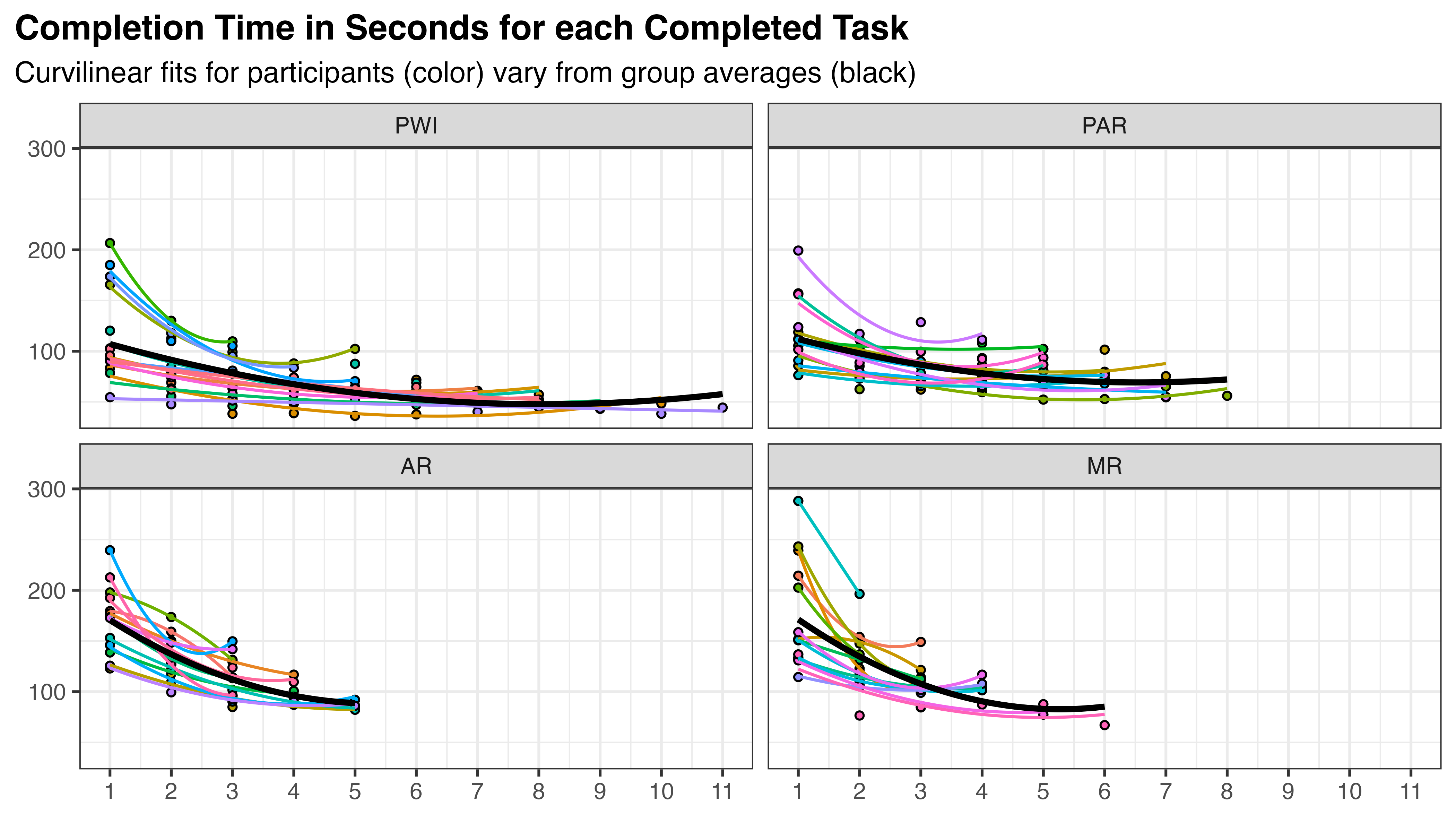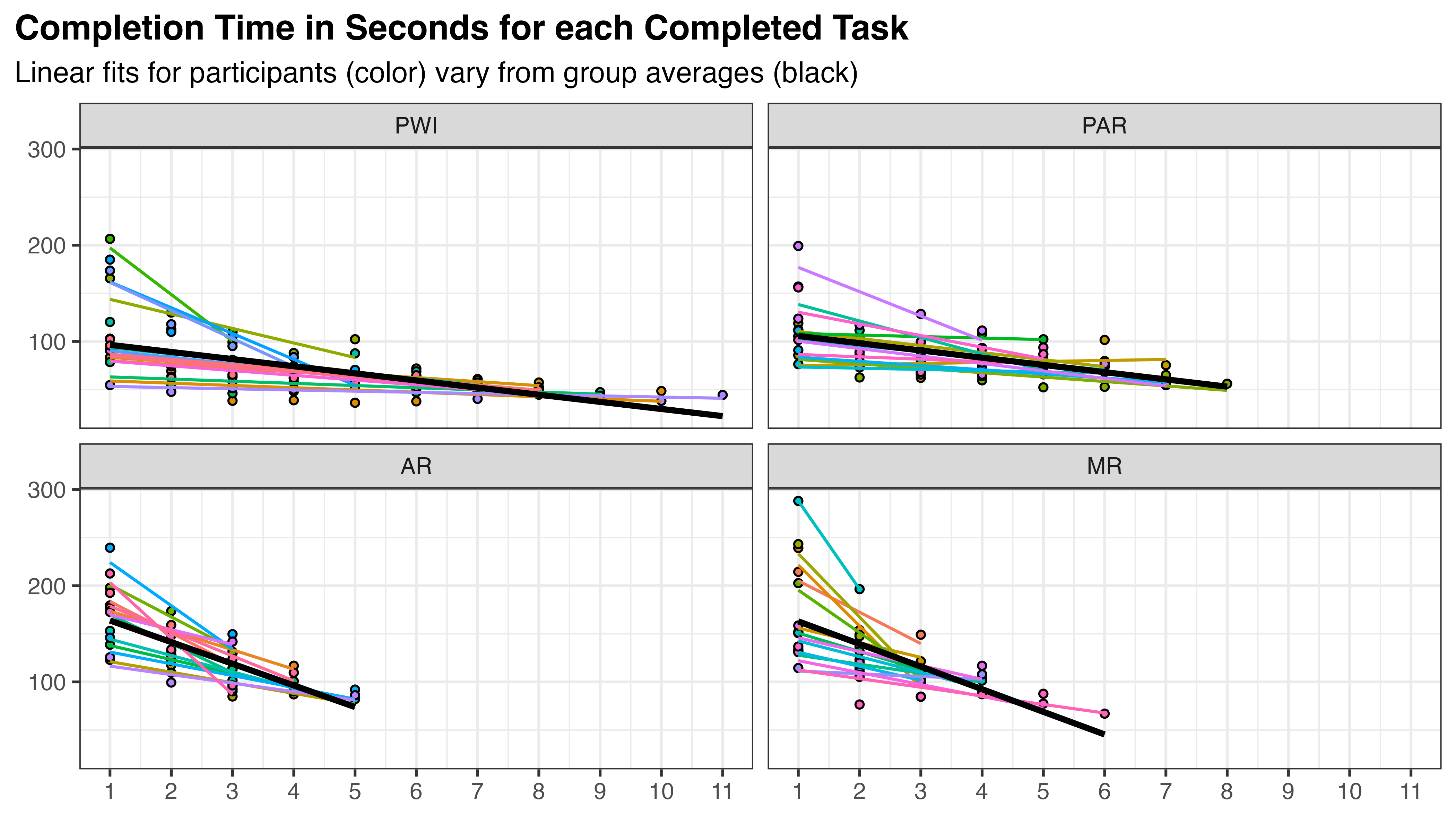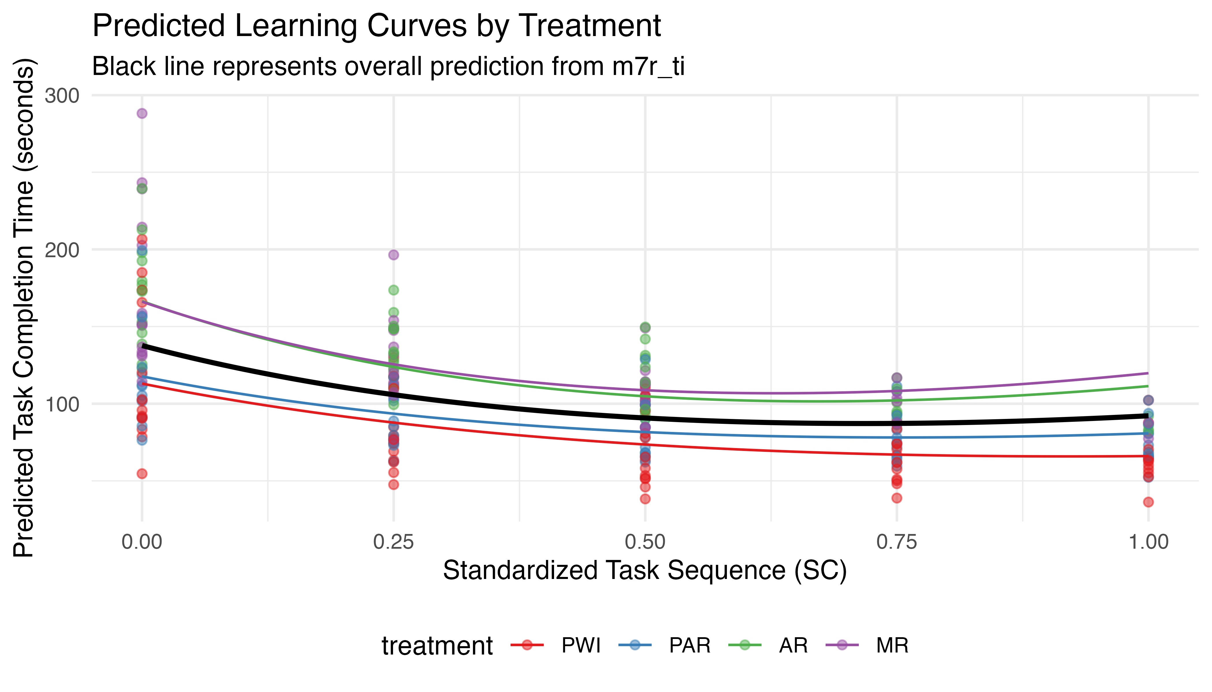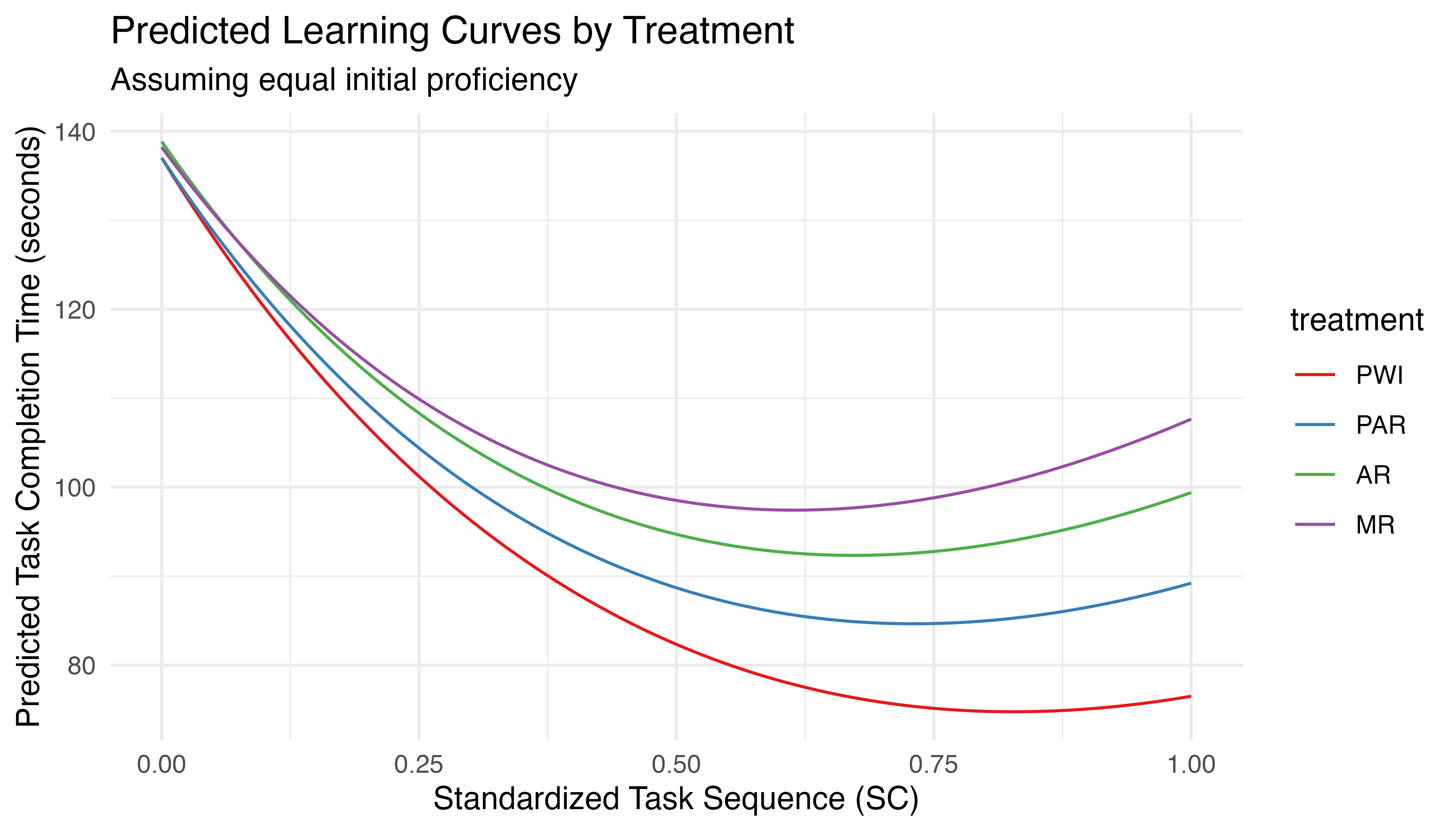 Participant 1063 was assigned to the AR treatment and contributed two completed learning-task observations. That session was marked by unusually severe system interruptions, rendering it unrepresentative of typical performance. For that reason, the participant’s first-session data were excluded from subsequent hypothesis testing.↩︎