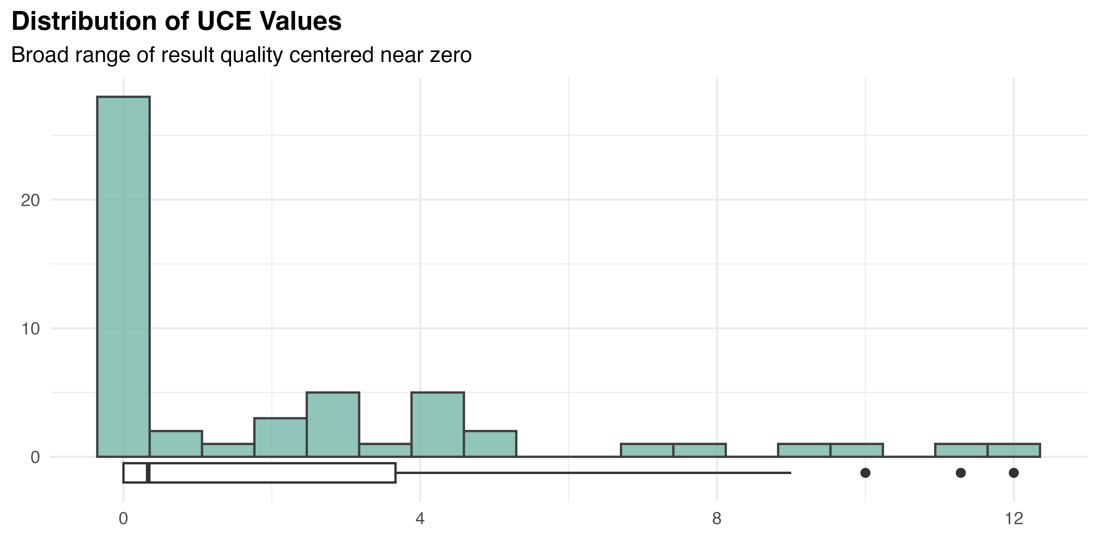 Compared to TCT, with a coefficient of variation (CV) of 0.45, UCE shows substantially greater spread (CV=1.37) and the presence of a floor effect. The latter could potentially suggest limitations in the task’s ability to capture a full range of participant performance. Further investigation is required to determine if this is due to task complexity or other factors.