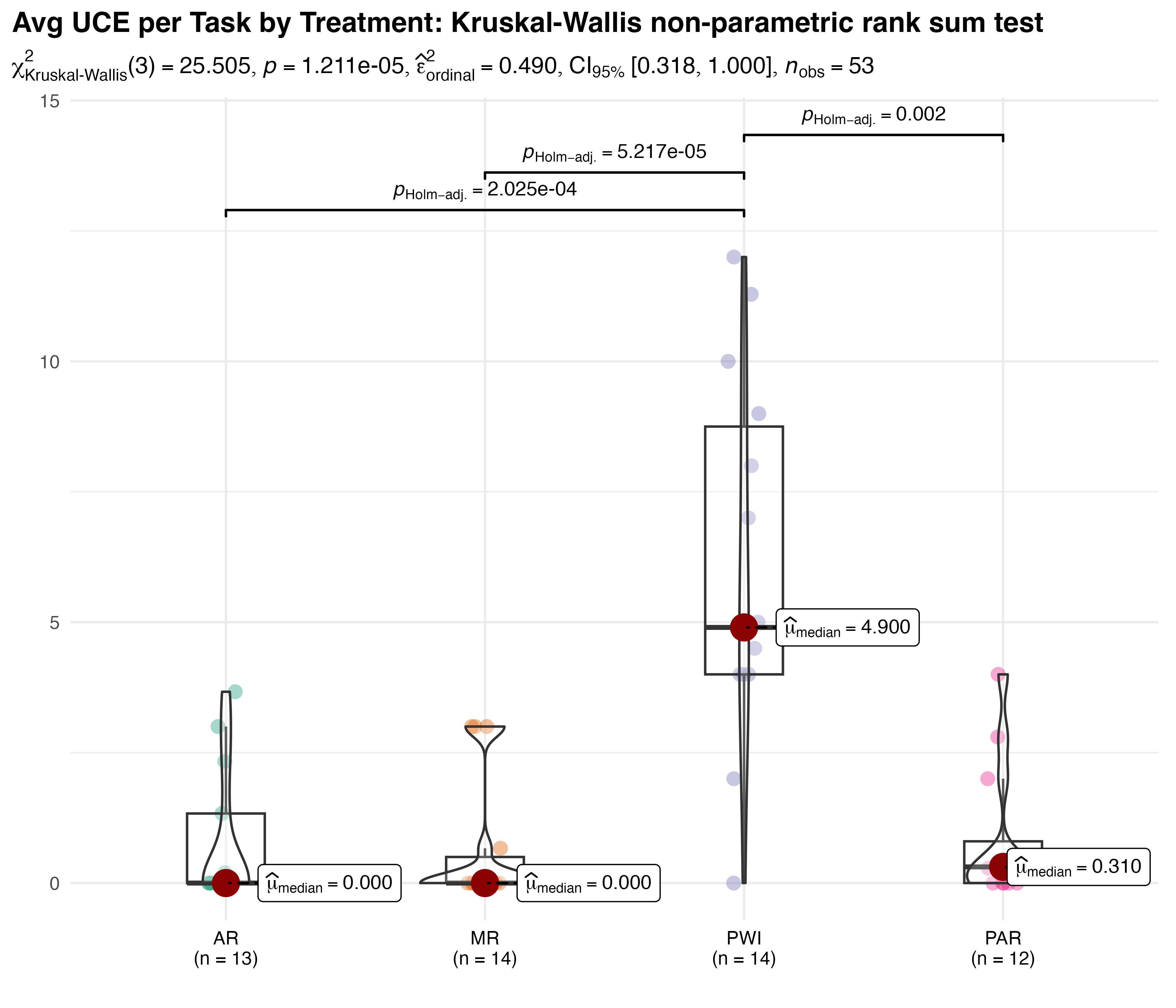 Table 5.3 presents participant-level metrics, including the number of tasks completed along with the average TCT and UCE per task. In addition to the overall results, the data is decomposed by assigned treatment group to allow for comparisons across conditions. Note that the statistics presented are the overall (aka “grand”) mean and median values. That is, they are the average or middle values of all individual participant averages. This provides overall summary statistics for each treatment group that reflect the central tendency and variability among the average outcomes reported by participants within each group.