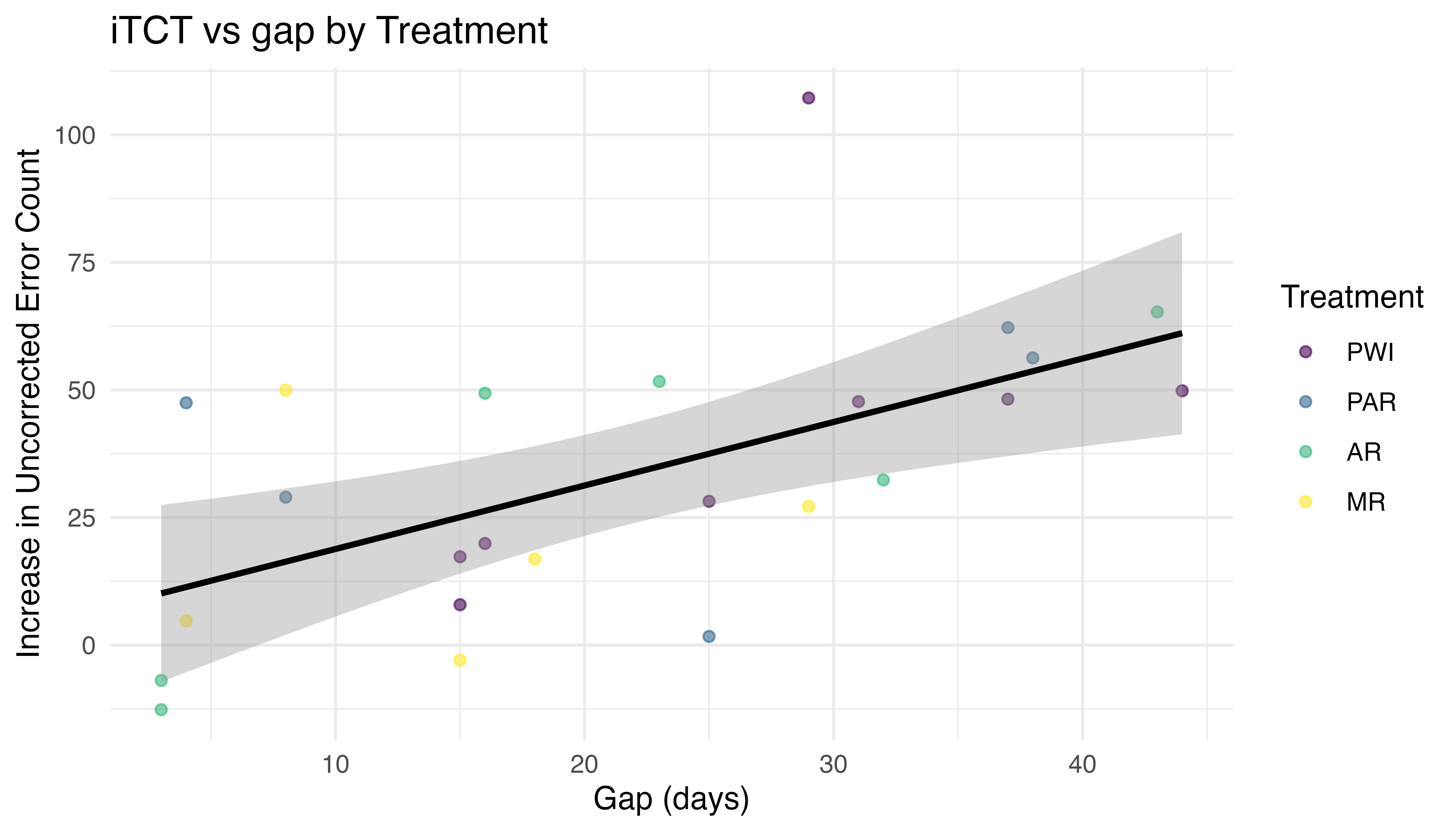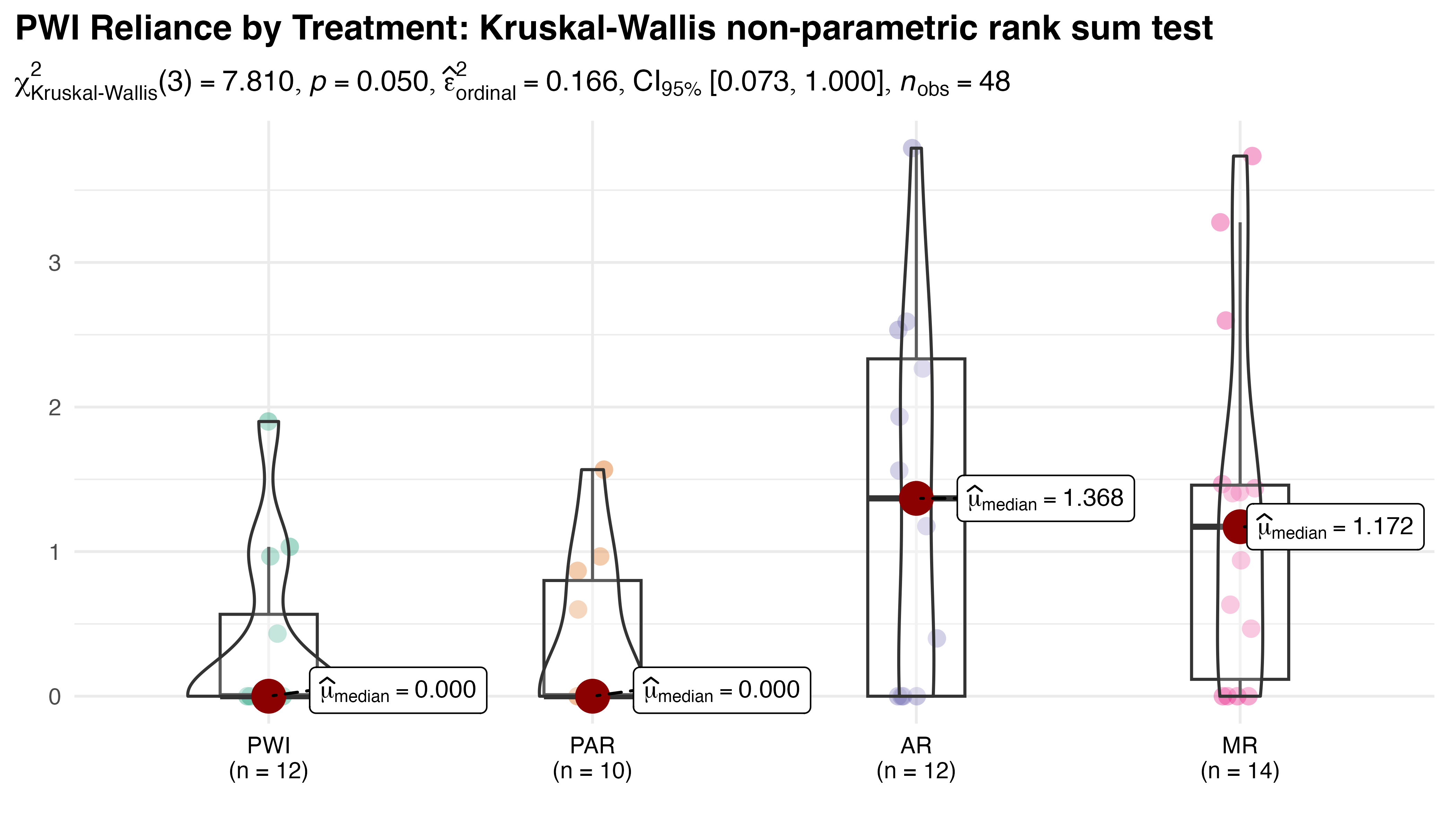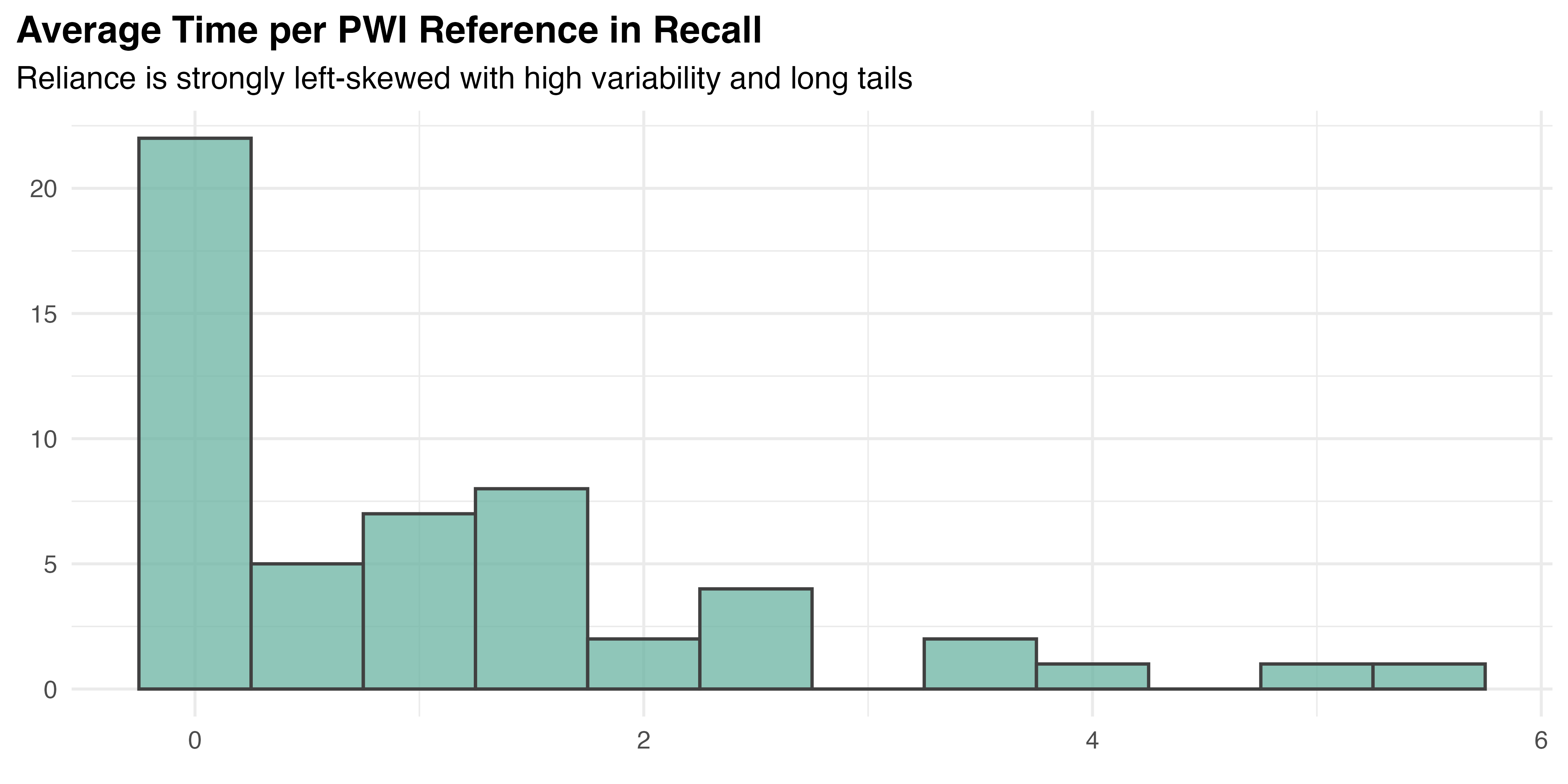 This change affected the \(H_{2b}\) analysis only, reducing the aggregated sample for reliance tests from 53 to 48: PWI 12, PAR 10, AR 12, and MR 14. The broader recall dataset used for other recall analyses in this chapter was unchanged.↩︎