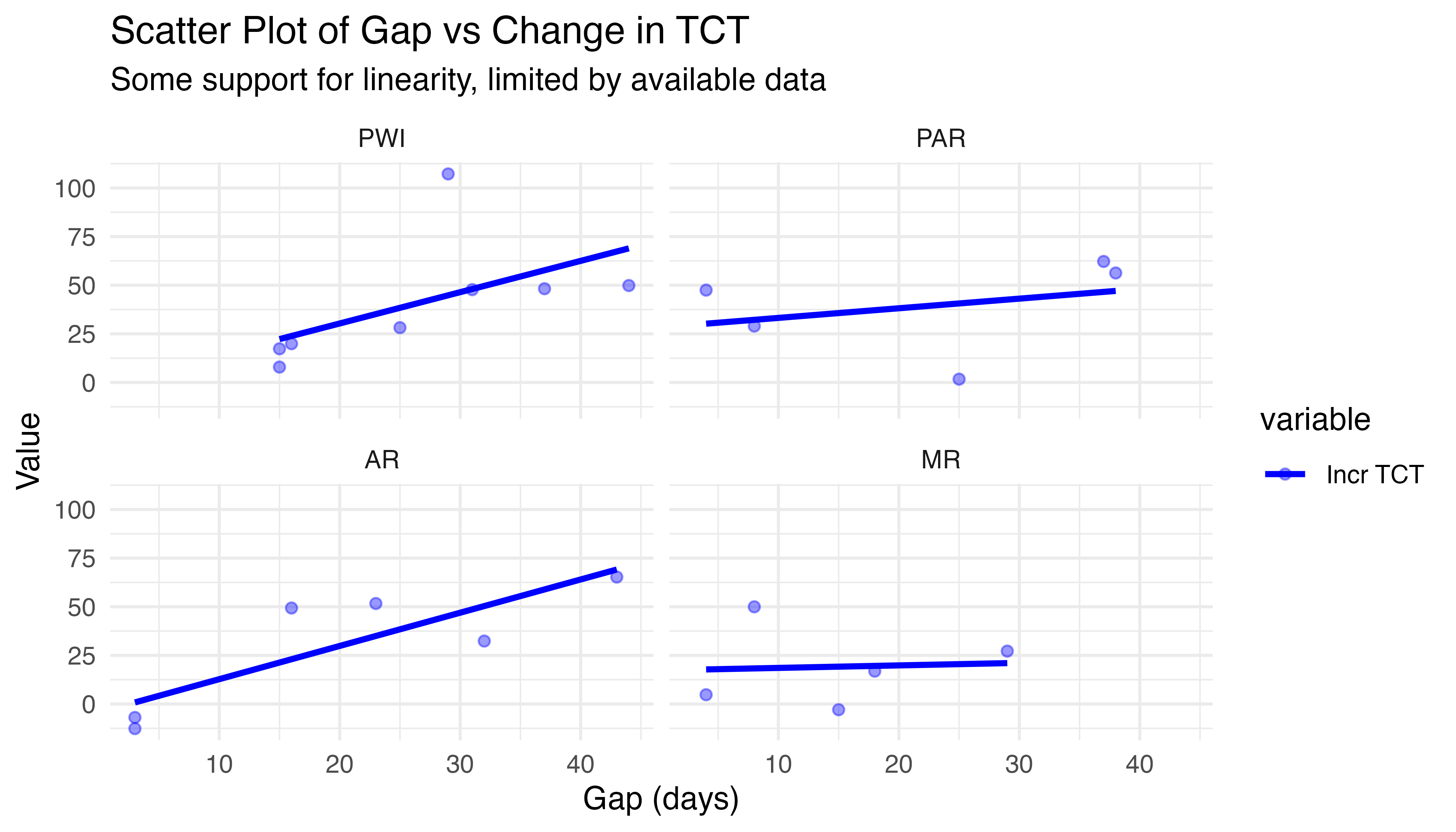 Parametric methods also require a normal distribution of data within each treatment group. As noted in the original assessment of the learning data, the overall TCT dataset exhibits skewness and kurtosis, suggesting deviations from a normal distribution. This must be revisited with group wise testing of the aggregated data. By averaging the observations and eliminating an outlier, the grouped data may better resemble a normal distribution.