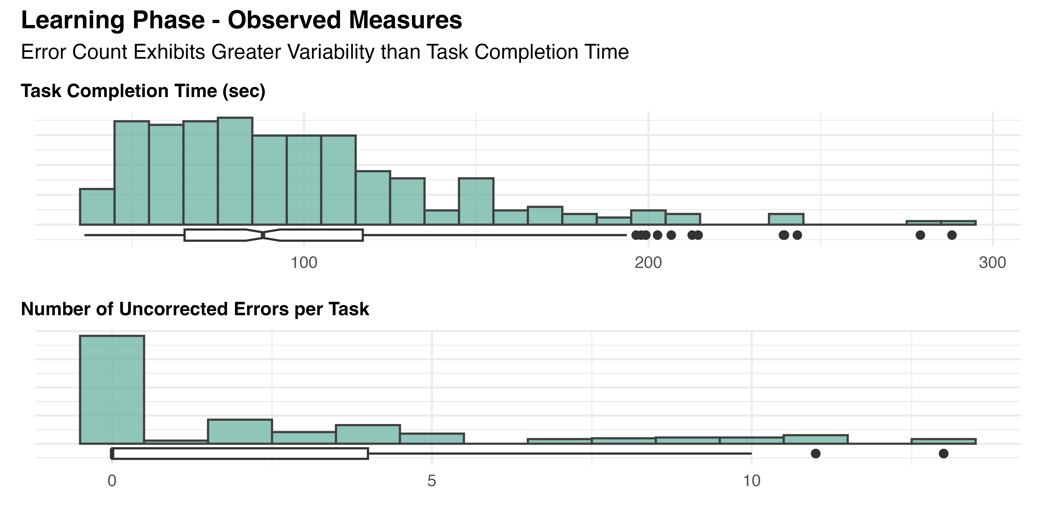 These statistics provide a high-level summary of performance across all tasks and participants, where each observation corresponds to a single repetition of the Learning task. Both Task Completion Time (TCT) and Uncorrected Error Count (UCE) show considerable variance, as depicted in Figure 5.5.