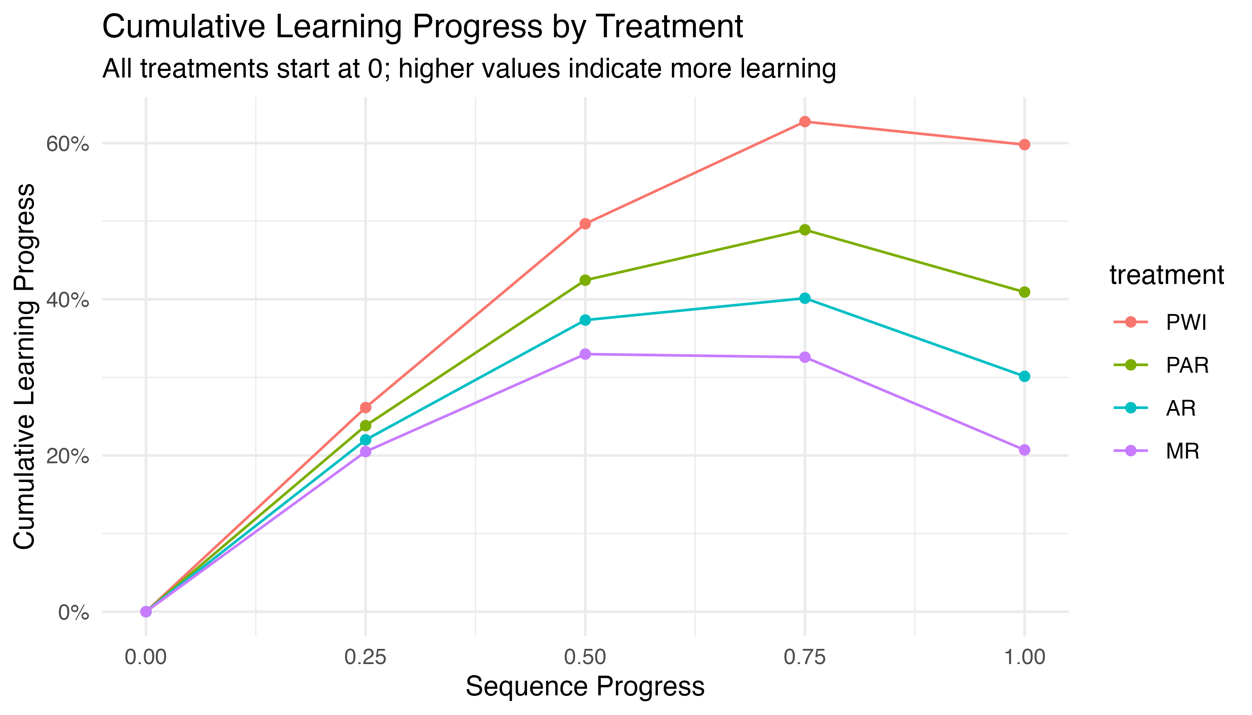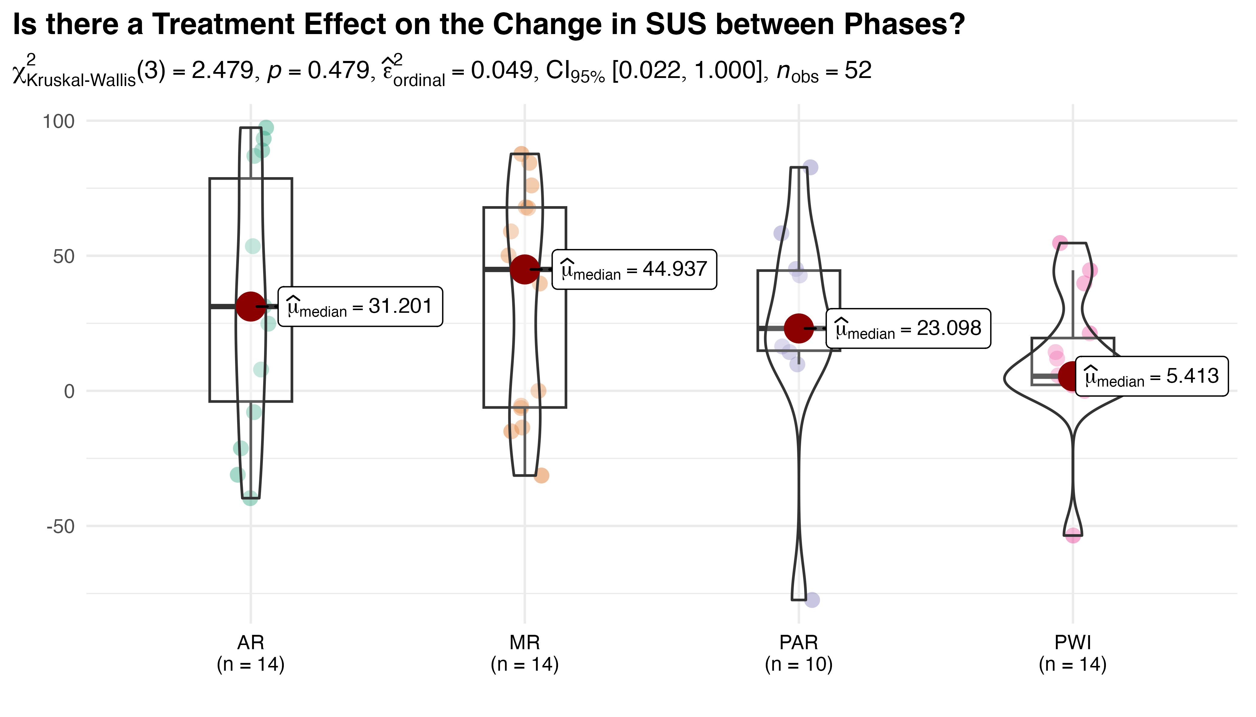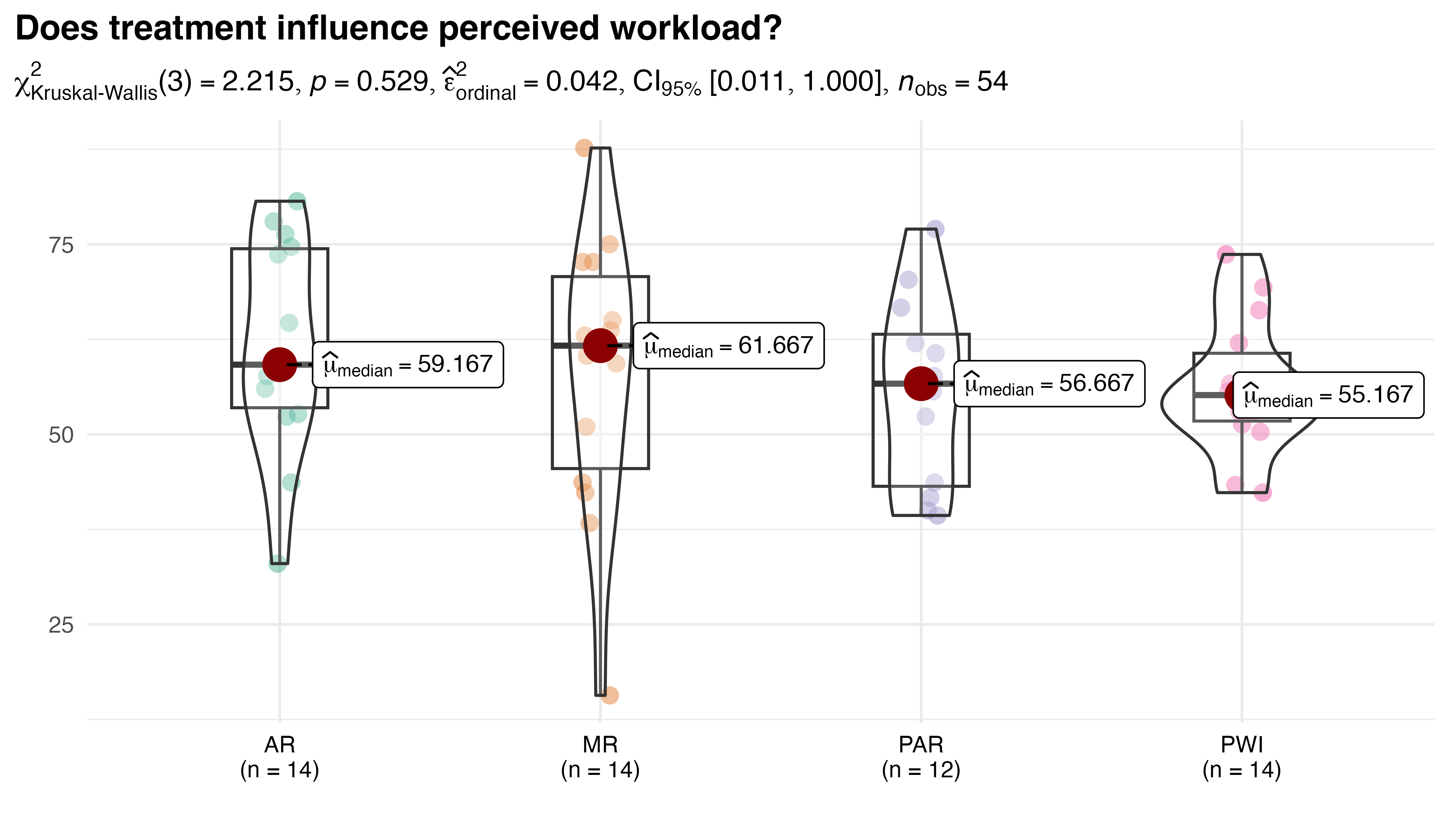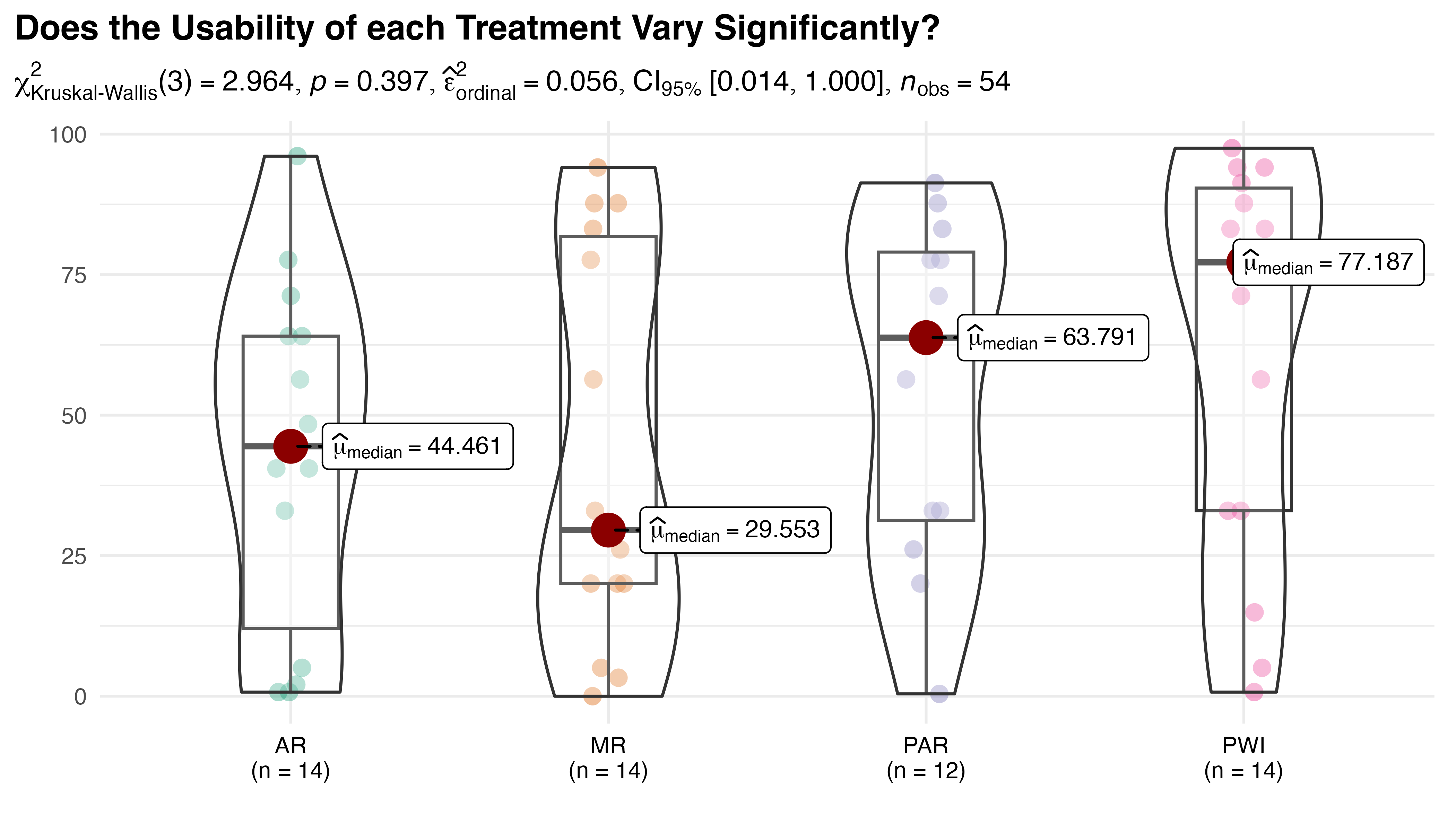 No statistically significant overall difference is identified (p = 0.40), likely due to the very large range of scores found in every treatment. While the effect size is quite small (\(\hat{\varepsilon}_{rank}^{2}\) = 0.056), the progression of median values aligns with expectations based on the complexity associated with each treatment: PWI > PAR > AR > MR. This suggests that, while the technologies differ in complexity, their perceived usability during learning is not drastically different–an unexpected result.