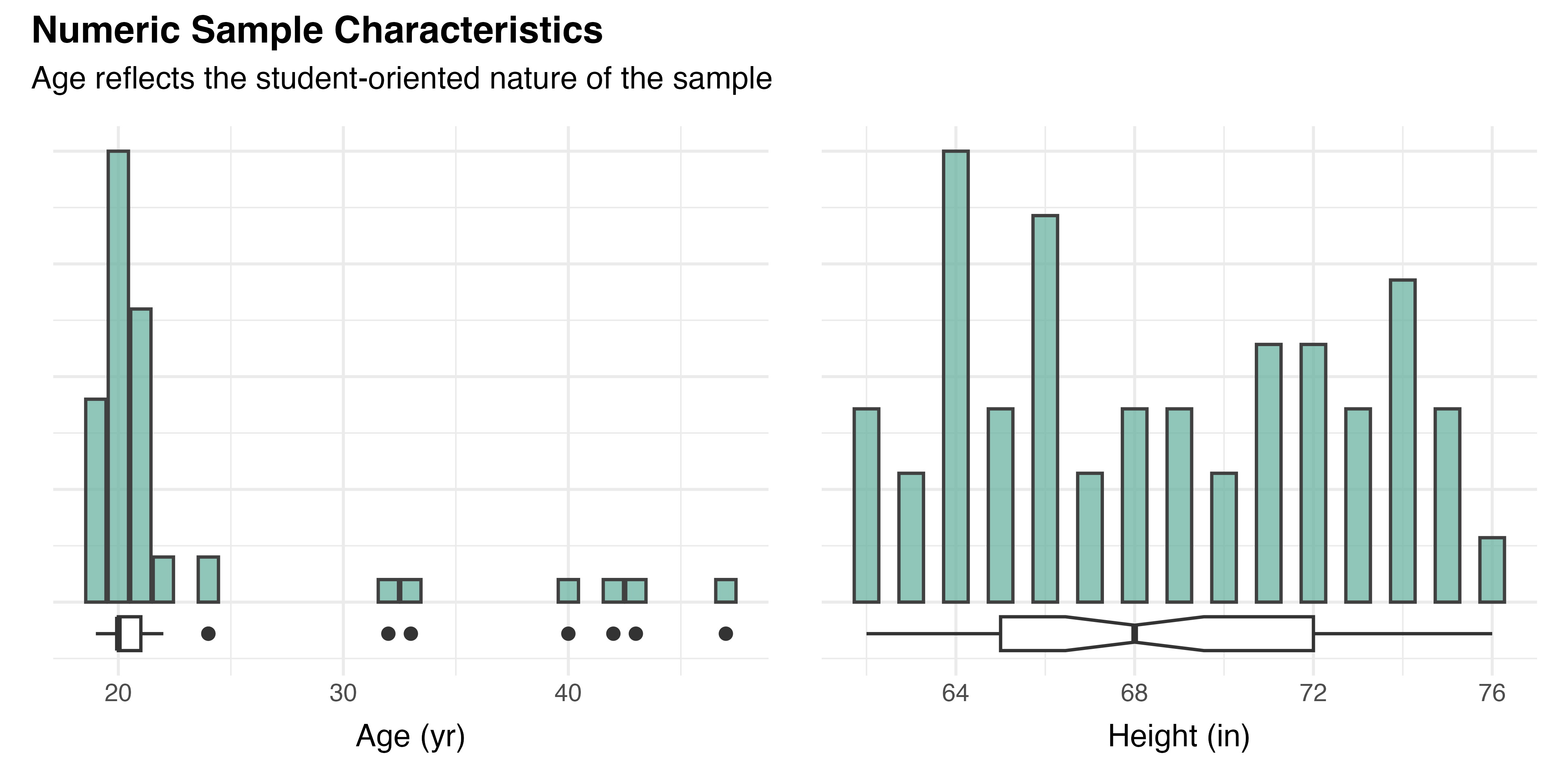 After excluding data from the pilot study, 54 participants (Mean age = 22.6, SD = 6.5, range: [19, 47], 3.7% missing) were included in this analysis. Other than age, height (Mean height = 68.6, SD = 4.2, range: [62, 76], 5.6% missing) was the only numeric demographic data collected. As discussed in Section 5.7, height was first recorded following the pilot study, when its impact on user behavior and results was first observed. Both numeric characteristics are visualized with a combined box and scatter plot in Figure 5.2. Where present, the notches of these box plots show the 95% confidence interval around the median.