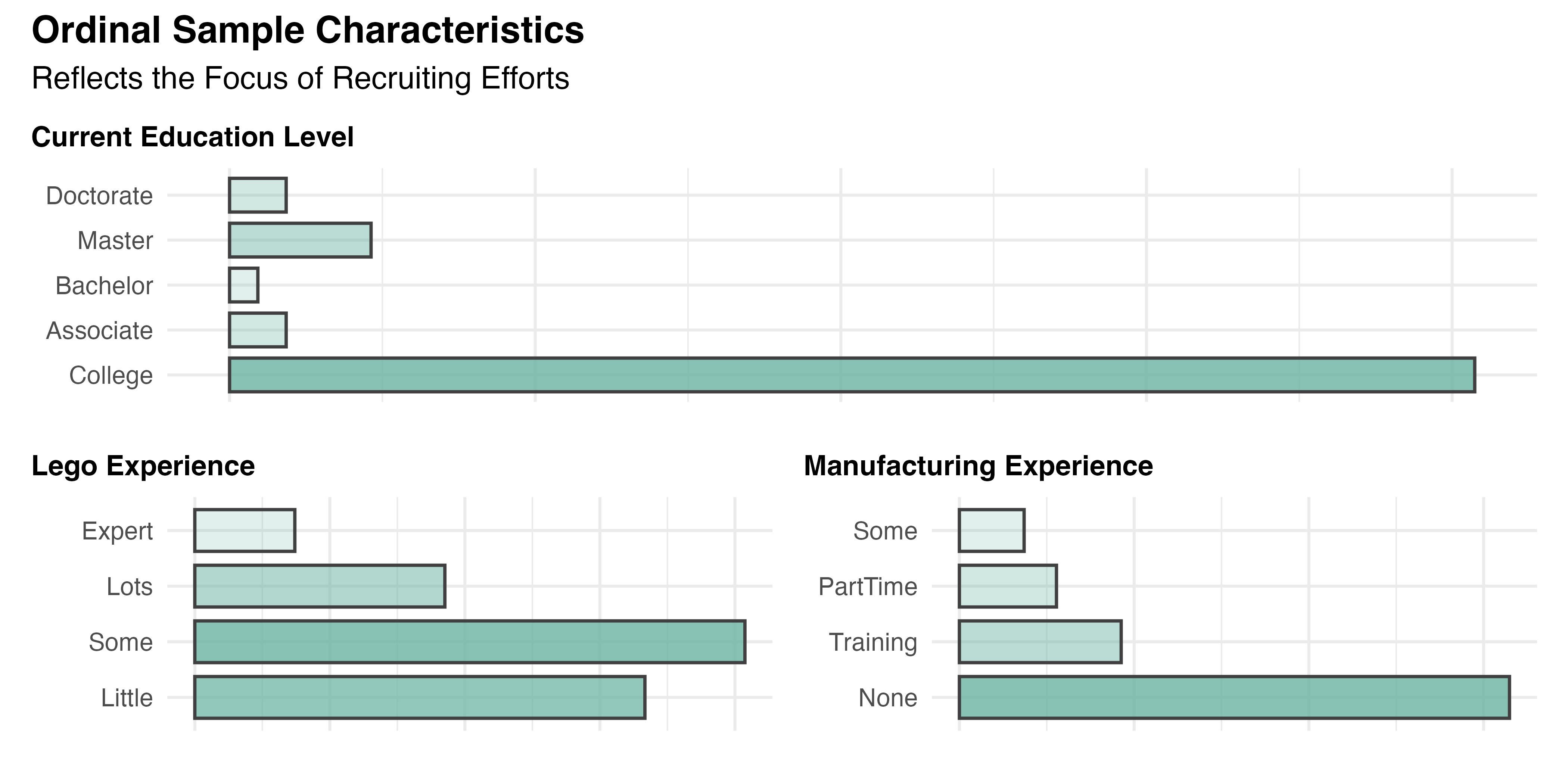 Unlike the data above, the categories analyzed in this section are inherently ordered. Responses for each participant’s current Education level (Median = 3.0; Mode = 3, CND; IQR = 0.0) and their experience with Lego (Median = 2.0; Mode = 2, Some experience; IQR = 1.8) and Manufacturing (Median = 1.0; Mode = 1, No experience; IQR = 1.0) are visualized in increasing order by Figure 5.4. The results are mostly in line with expectations based on the recruitment, though it is disappointing to see that 33% of participants (n=18) claimed to have little to no experience with Lego. The great majority were undergraduate students working towards a degree (n=44, 81%), with no experience in manufacturing (n=34, 63%).