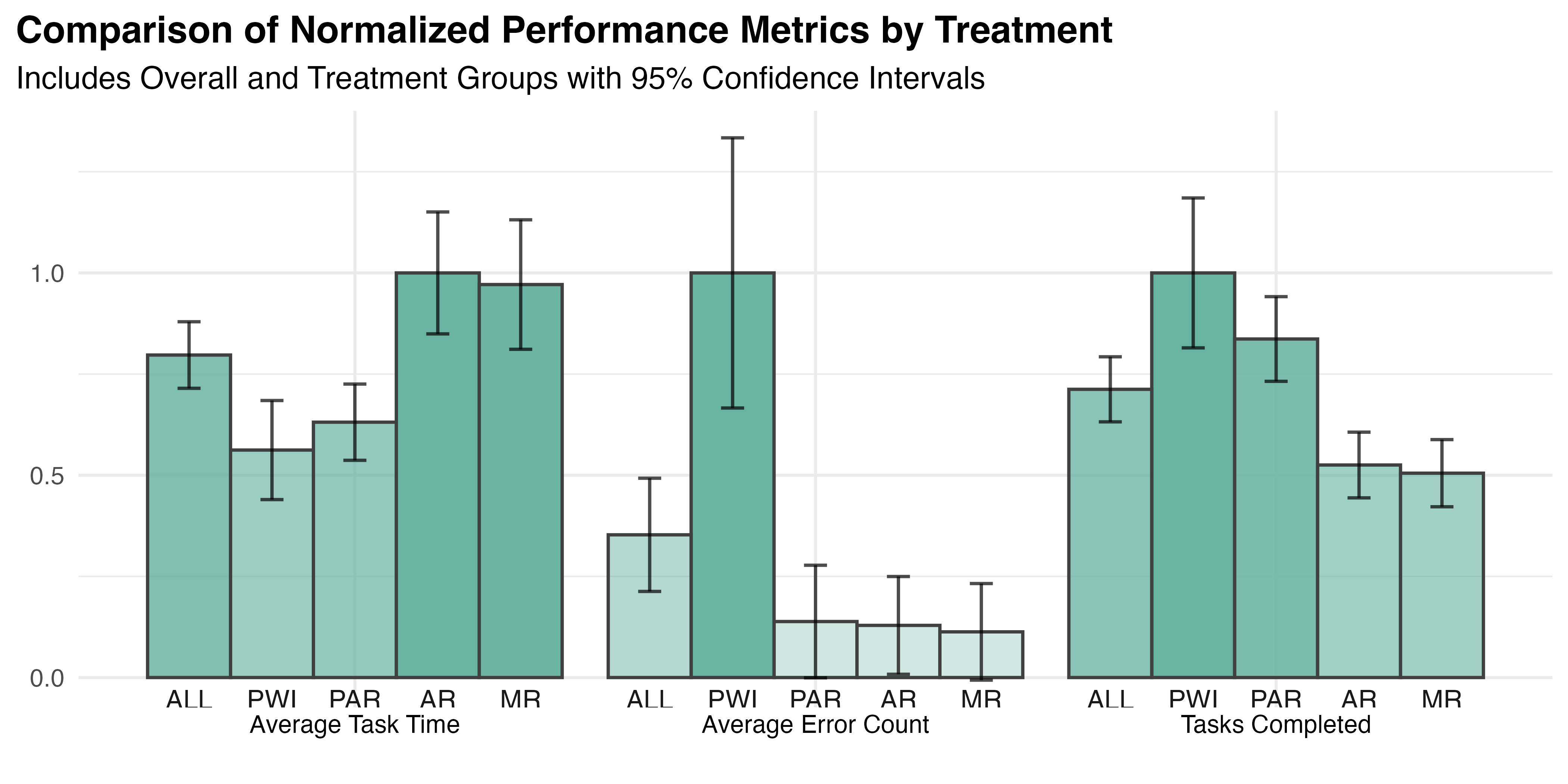 The SUS analysis revealed several key findings. During the learning phase, the overall usability reported for all instructional technologies was substantially below commercial benchmarks. This includes both the PAR, a commercial system, and PWI, the experimental control and standard instructions for the lab. While poor by SUS benchmarks, the relative scores for each treatment generally aligned with observed interactions and participant feedback. No statistically significant differences in usability were reported for the treatments used during learning. This unexpected result suggests that, while the technologies differ in complexity, their perceived usability during learning is not drastically different. Individually, participants experienced a significant increase in SUS with phase, but there isn’t sufficient evidence to attribute that change to the assigned treatment, despite large observed differences and effect sizes. Furthermore, the magnitude of usability improvement did not differ significantly between treatments.
