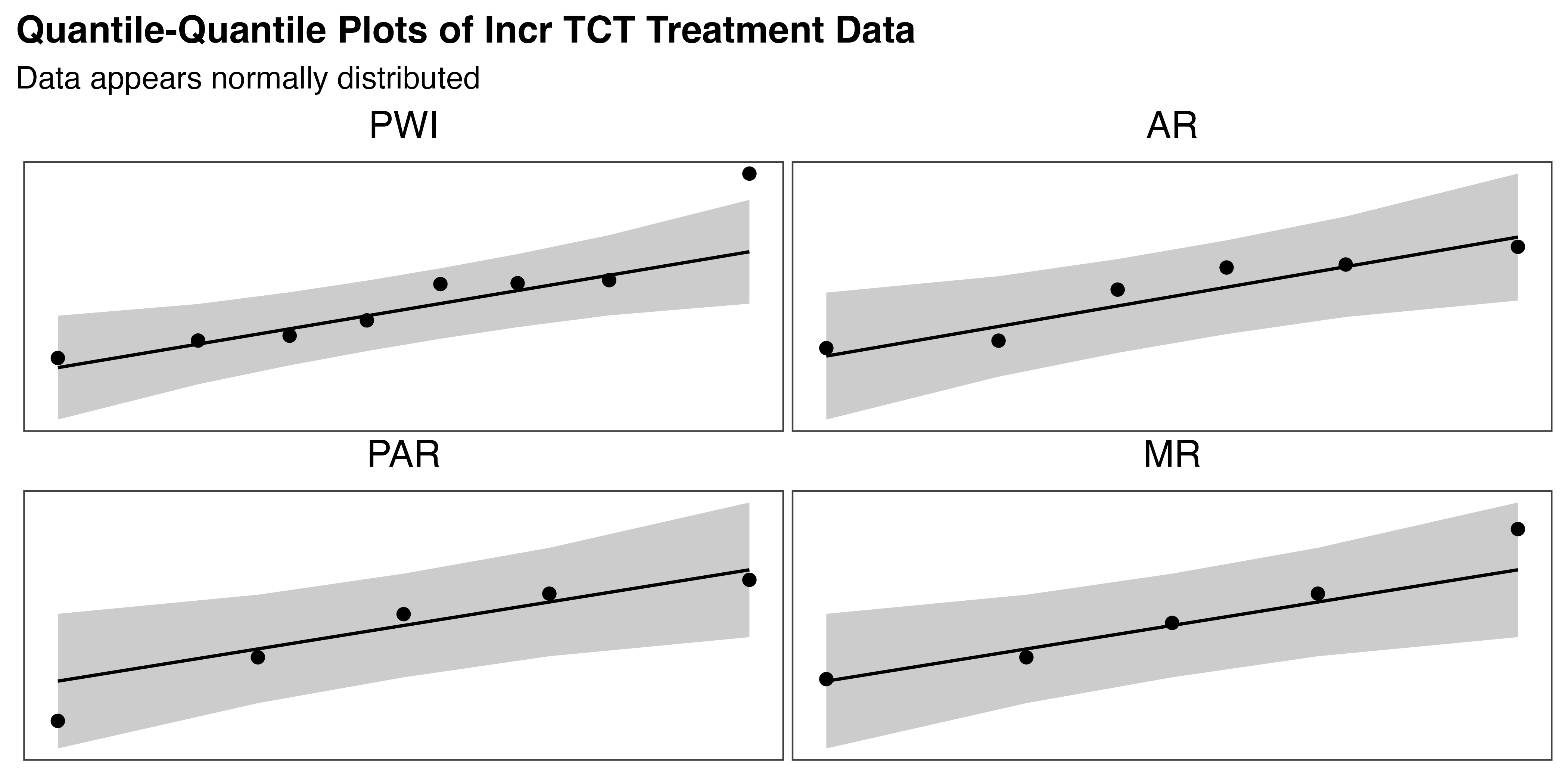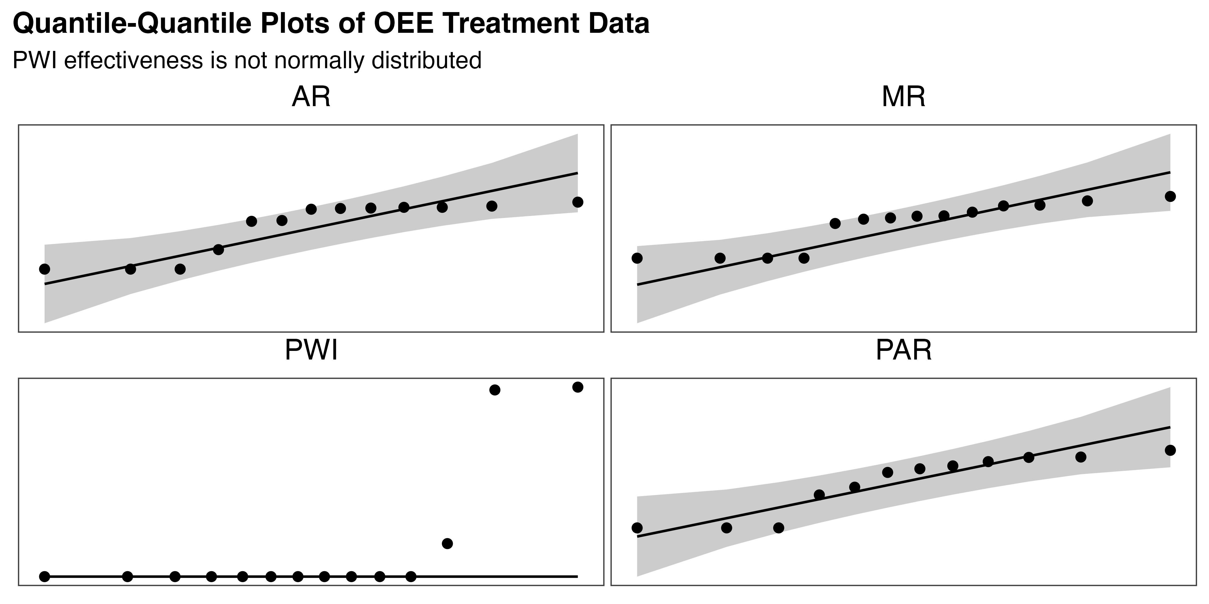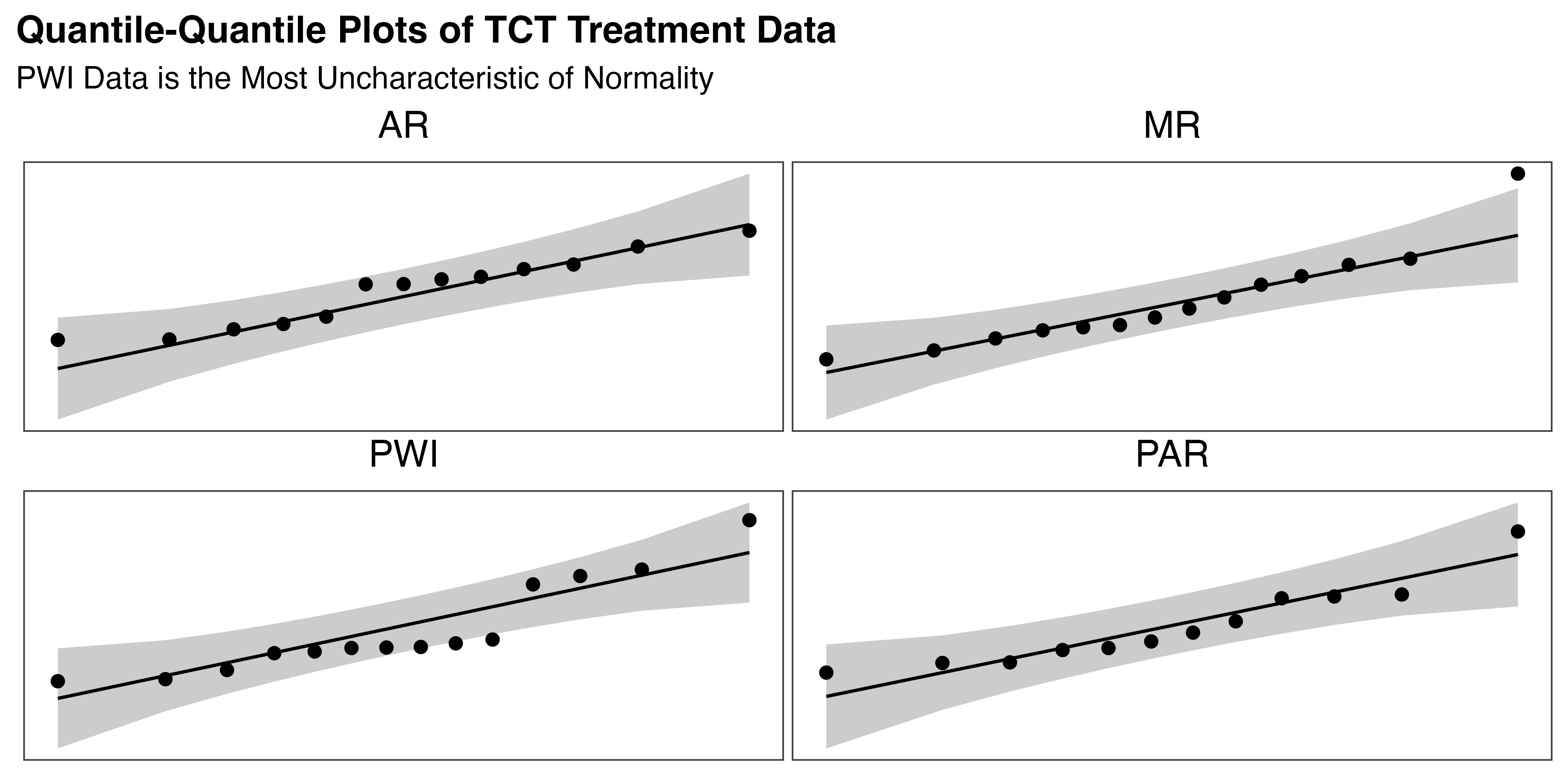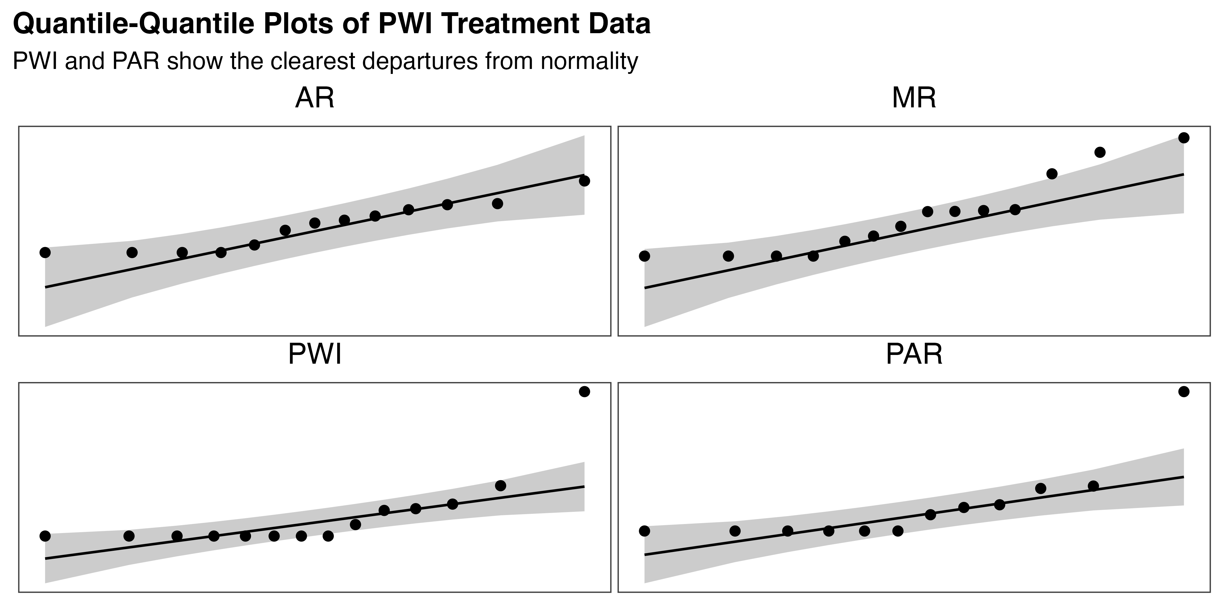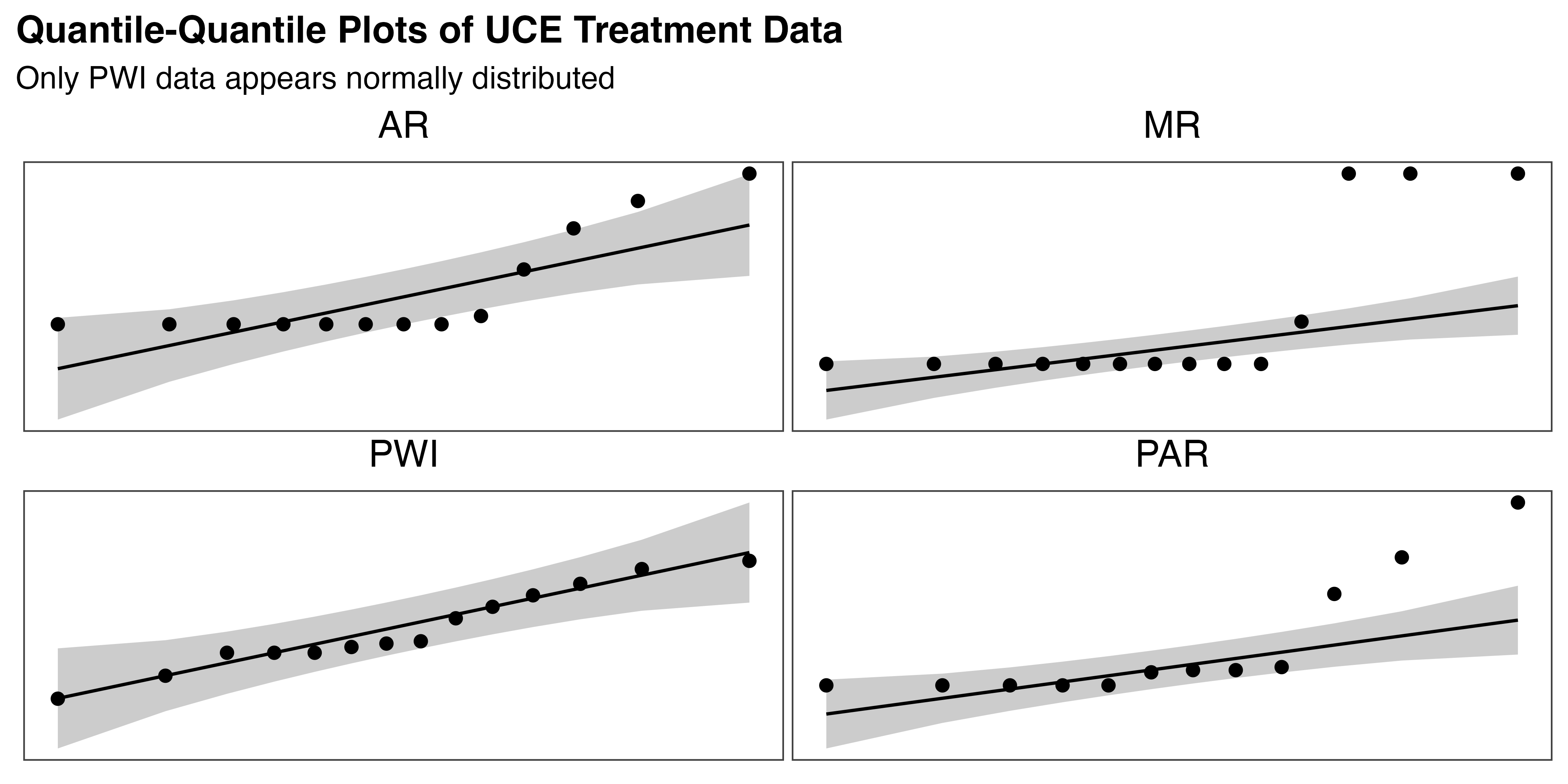 To reconcile these findings for MR and PWI, and confirm those for AR and PAR, the set of four Q-Q plots in Figure 5.7 were generated. Observations for normal data should fall along or near the line, within the shaded confidence interval. These plots show that PAR and AR both meet the expectations of normality. The MR group mostly aligns with the line, except for a single point in the right tail. This aligns with the skewness and kurtosis test results and provides insufficient evidence to reject normality. On the other hand, the PWI group diverges substantially from the line, with several points leaving the confidence interval. This supports the statistical evidence that the PWI data is not normally distributed.