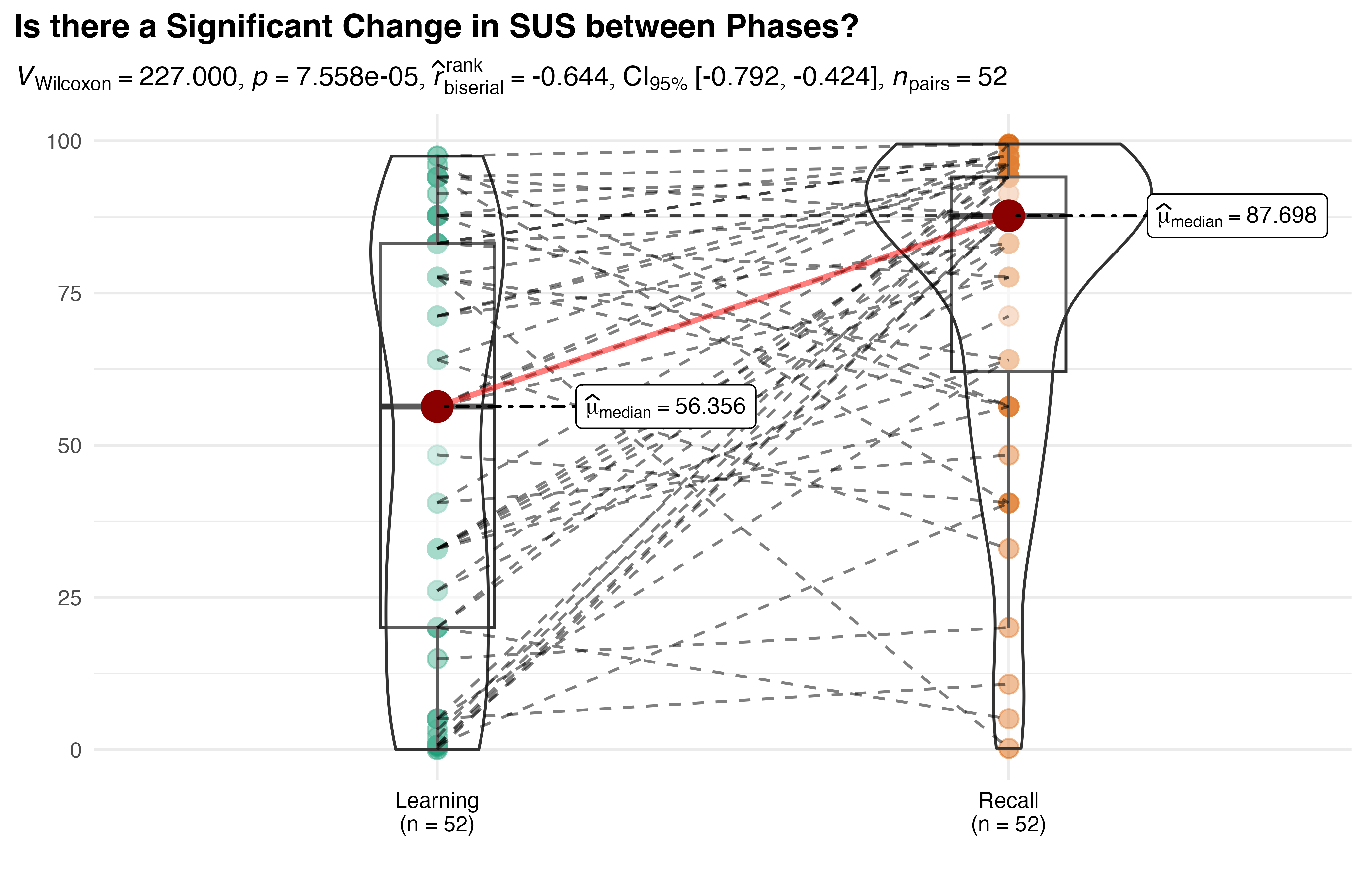 Those learning scores were compared with SUS during recall to test for significance using the Wilcoxon signed rank test for paired samples. As seen in Figure 5.40, the difference is statistically significant (p < 0.001) and practically meaningful. The median value for \(SUS_{R}\) (87.70) is a 31.34 point improvement in usability from the learning phase (\(SUS_{L}\) = 56.36). The large negative effect size (\(\hat{r}^{2}_{biserial}\) = -0.644) with relatively narrow 95% confidence interval [-0.792, -0.424] suggests this finding is robust.