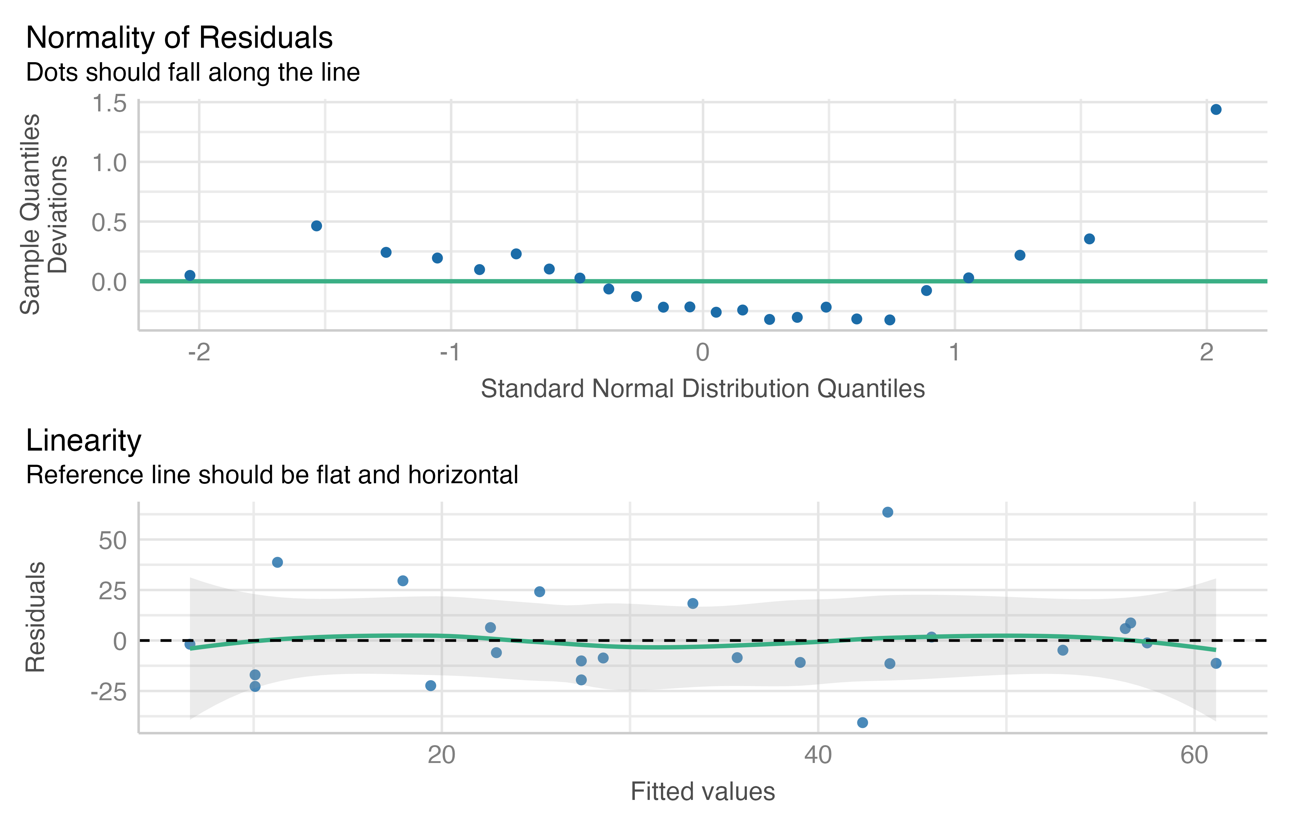 A combination of quantitative and qualitative analysis is required to accurately assess normality of each treatment group. Statistical tests provide a formal but imperfect measure of the data’s shape. Visual confirmation of the characteristic quantile-quantile (Q-Q) plot provides further support for the claim. Table 5.5 tabulates the results of the D’Agostino skewness test, Anscombe-Glynn kurtosis test, and the Shapiro-Wilk normality test. In each case, the null hypothesis (\(H_0\)) for these tests assumes that the data follows the characteristics of a normal distribution. Therefore, low p-values indicate evidence against \(H_0\), suggesting that the data deviates from normality in the tested aspect.