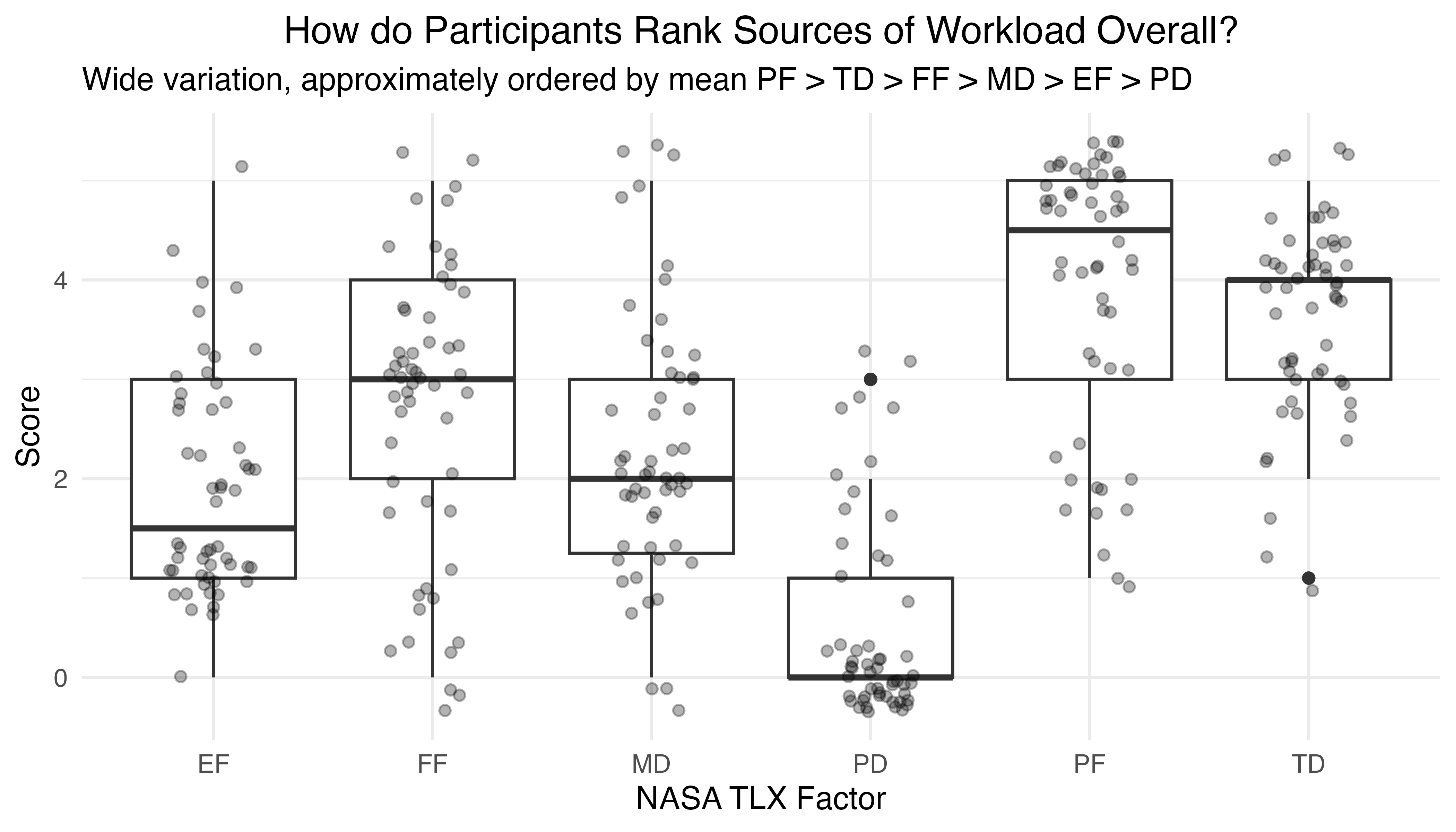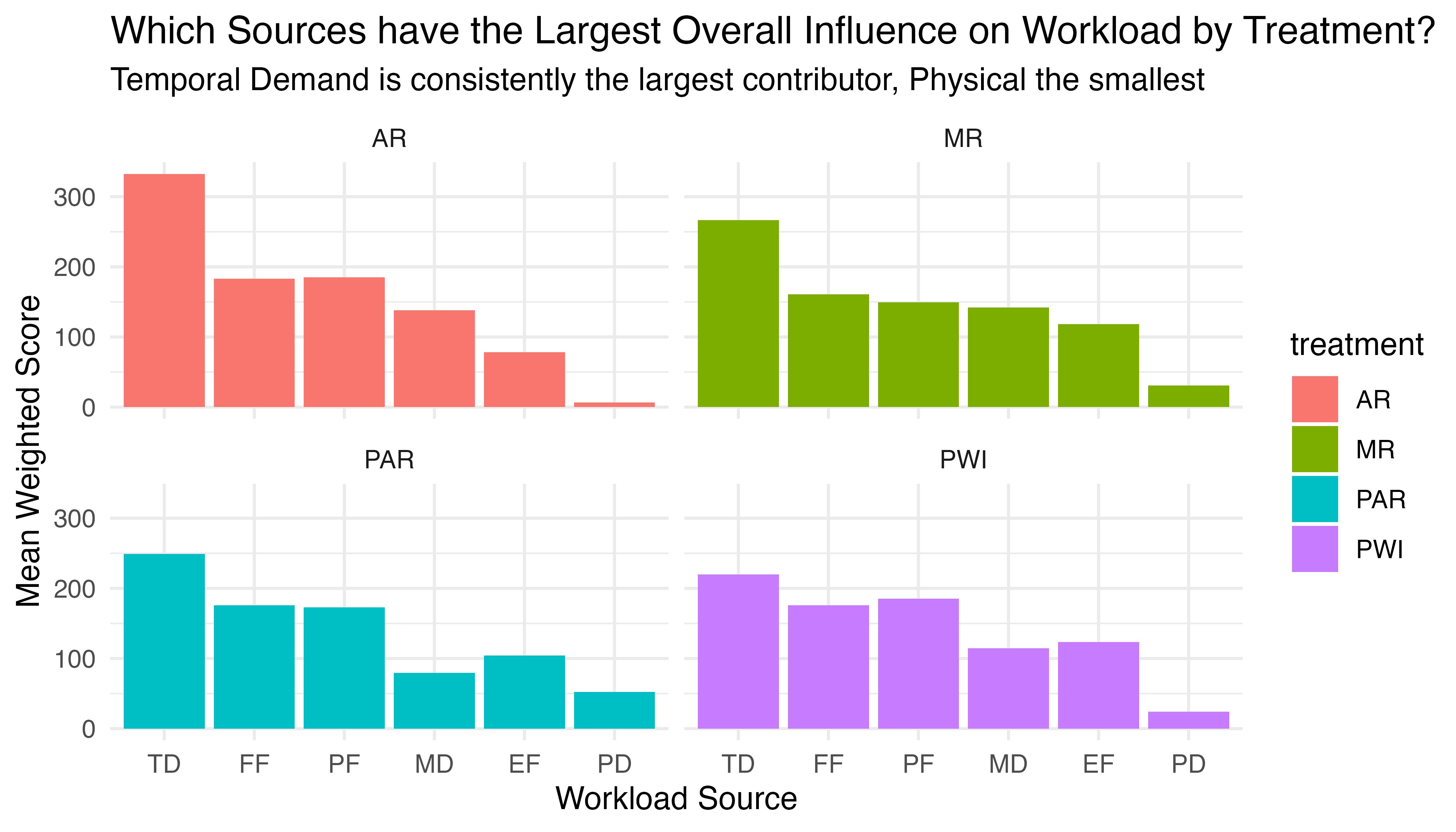 Friedman tests show these workload differences are significant for all treatments (p < 0.001 in each), confirming that the sources perceived most influential to overall workload vary by treatment. To explore the nature of those differences, Dunn’s test for pairwise multiple comparisons of ranked data is applied with Bonferroni correction. Of the 60 pairs tested9, seventeen significant differences were identified (AR: 6, PWI: 4, PAR: 4, and MR: 3), all involving Temporal Demand, Physical Demand, or both. The four central sources (FF, PF, MD, and EF) are each involved in 3-4 significant pairs.