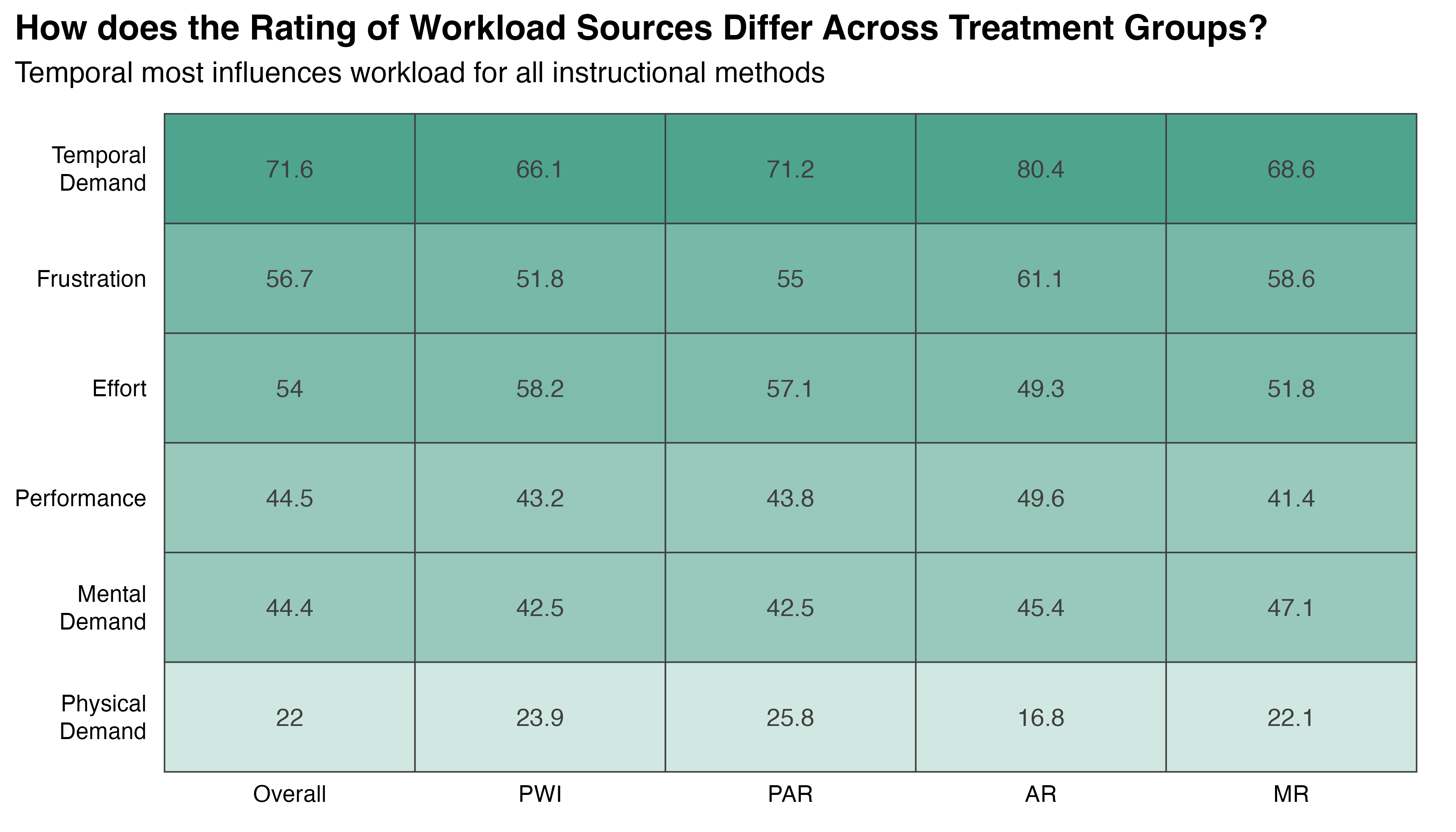 Consistent patterns of source ratings and workload across treatments are evident, but accompanied by little statistical significance. This may suggest that the inherent nature of the task, rather than the assigned instructional method, primarily determines which aspects of workload are most important to the participants. The high individual variability across TLX metrics also highlights the importance of considering personal factors in designing and implementing instructional technologies.