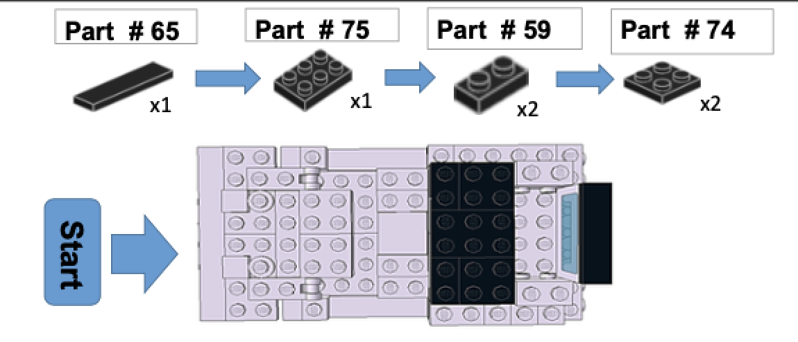 Instructions in the PWI treatment were unexpectedly problematic. An assumption of the experimental design was that the PWI would provide a well-tested and validated procedure for baseline performance. The research team’s prior experience with the instructions and untested confidence in their effectiveness led us to overlook these issues, which significantly impacted the PWI results. Their limitations quickly became clear, particularly when it came to discerning the type, placement, and orientation of black parts. Where the edge outline of other parts are relatively obvious, the edges of black parts are much more difficult to discern, especially in the top and three-quarter views. To compound this problem, various arrangements of parts 75, 59, 75, and 67 could achieve the results pictured in steps one and two. As a result, many participants incorrectly placed these parts, either due to misreading the instructions or simply deciding to improvise. It should be noted that the proper placement of these pieces was much more easily interpreted from the second and third step images, where earlier pieces are shown in grey, with obvious outlines. This seemingly obvious technique was only identified by one participant, at which time it was a revelation even to the research team.